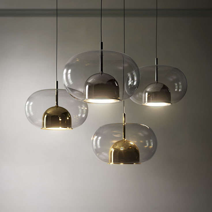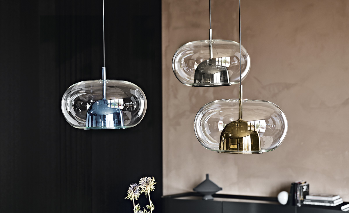 The Coimbra suspended glass lamp consists of a transparent sphere, flattened in the centre, which houses a painted glass bell inside. Everything about this design lamp, from its soft curves to the combination of complementary, transparent and reflective finishes, contributes to decorating a space with harmony and lightness, even when the light is off. Coimbra is suitable for lighting a dining room, with an asymmetrical composition on multiple heights, descending gently at a side table next to a sofa, or lighting a comfortable reading corner.