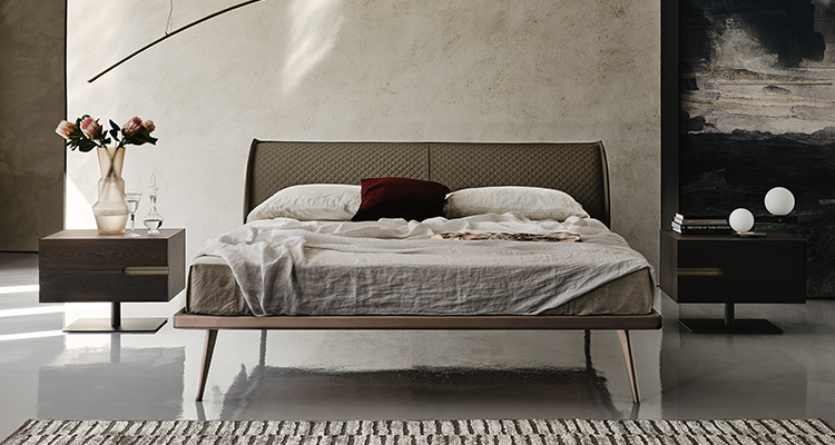 Sensual and enveloping, the Ayrton bed created by Andrea Lucatello injects a timeless, harmonious design into a modern bedroom. The sumptuousness of the Ayrton modern double bed is thanks to the padded headboard. Its upholstery is made of exquisite materials decorated with refined diamond quilting and manufactured with high-quality techniques. The headboard sides are slightly protruding; thanks to this shape, the bed seems to hug and guard the dreamers who sleep within. Ayrton is a unique modern bed with a contrasting personality, balancing the soft and caring padding with the harsh design of the steel feet, embellished with bright finishes.