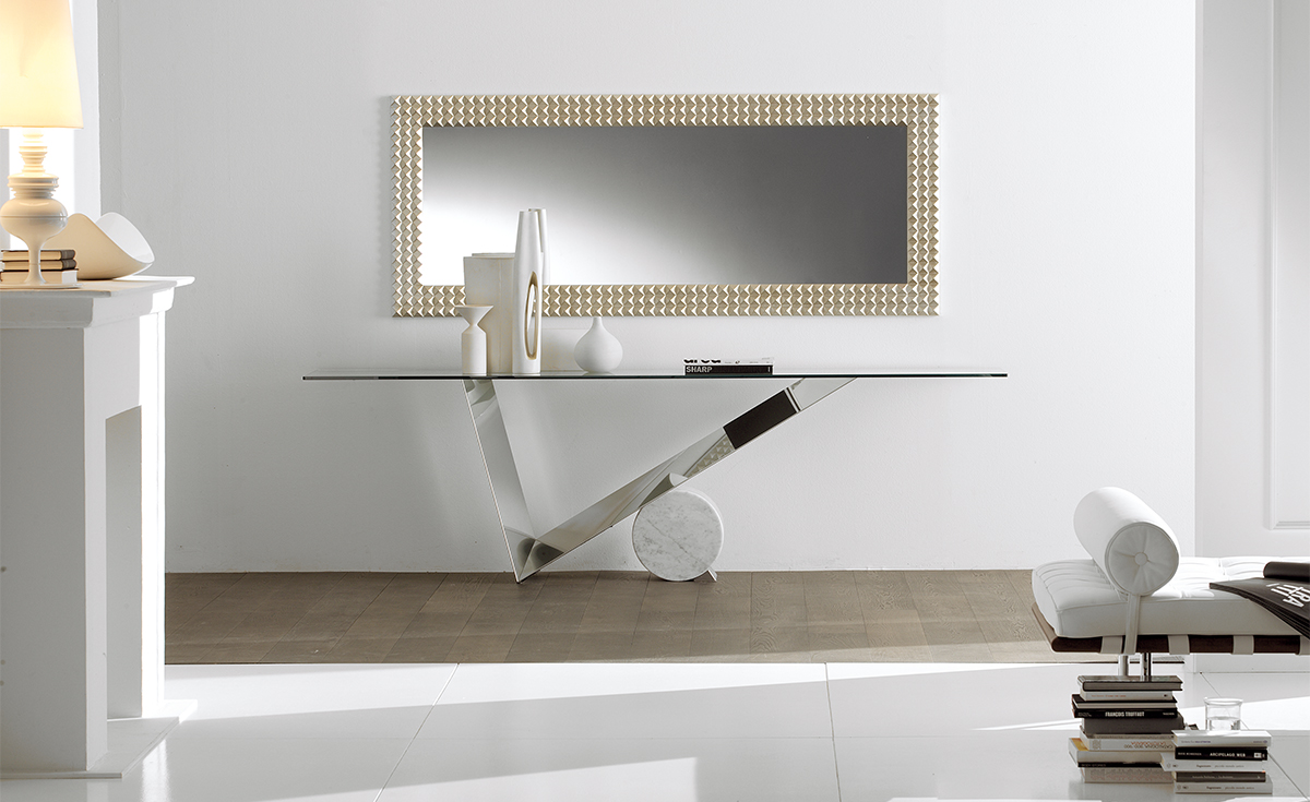 Console with polished stainless steel base and cylinder in Travertine (TN), Black Marquina (NM) or white Carrara (BC) marble. Top in 12mm clear or smoked glass, laid on the top. Small reflection irregularities on the base are due to manual processing.