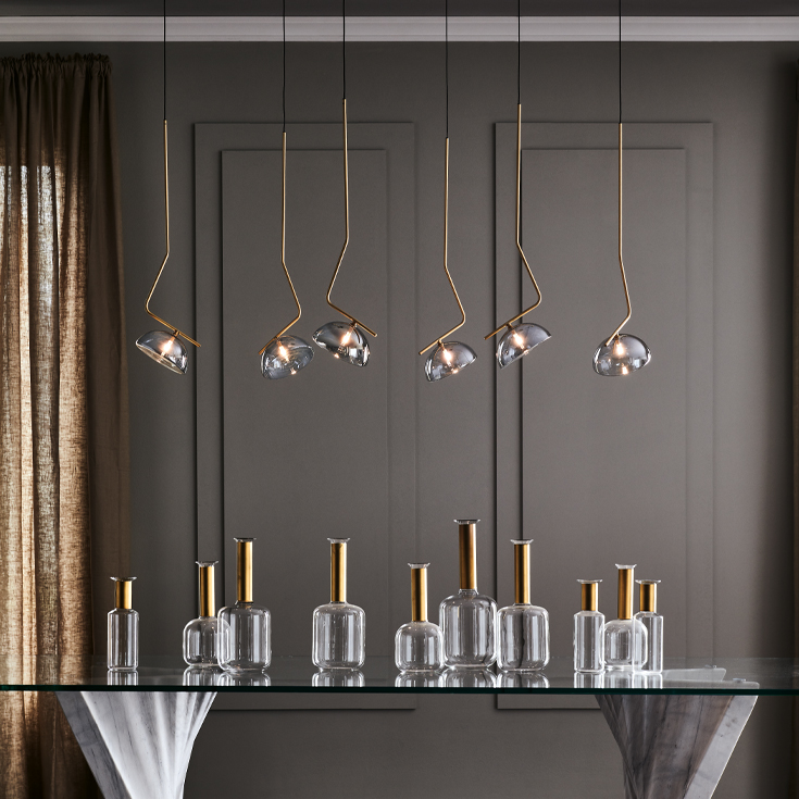 Lámpara de techo y sobremesa con estructura en latón y pantalla en cristal fumé. Soporte de techo en acero cromo negro (06). S2/12: soporte redondo para 2/12 pantallas. Bombilla incluida.