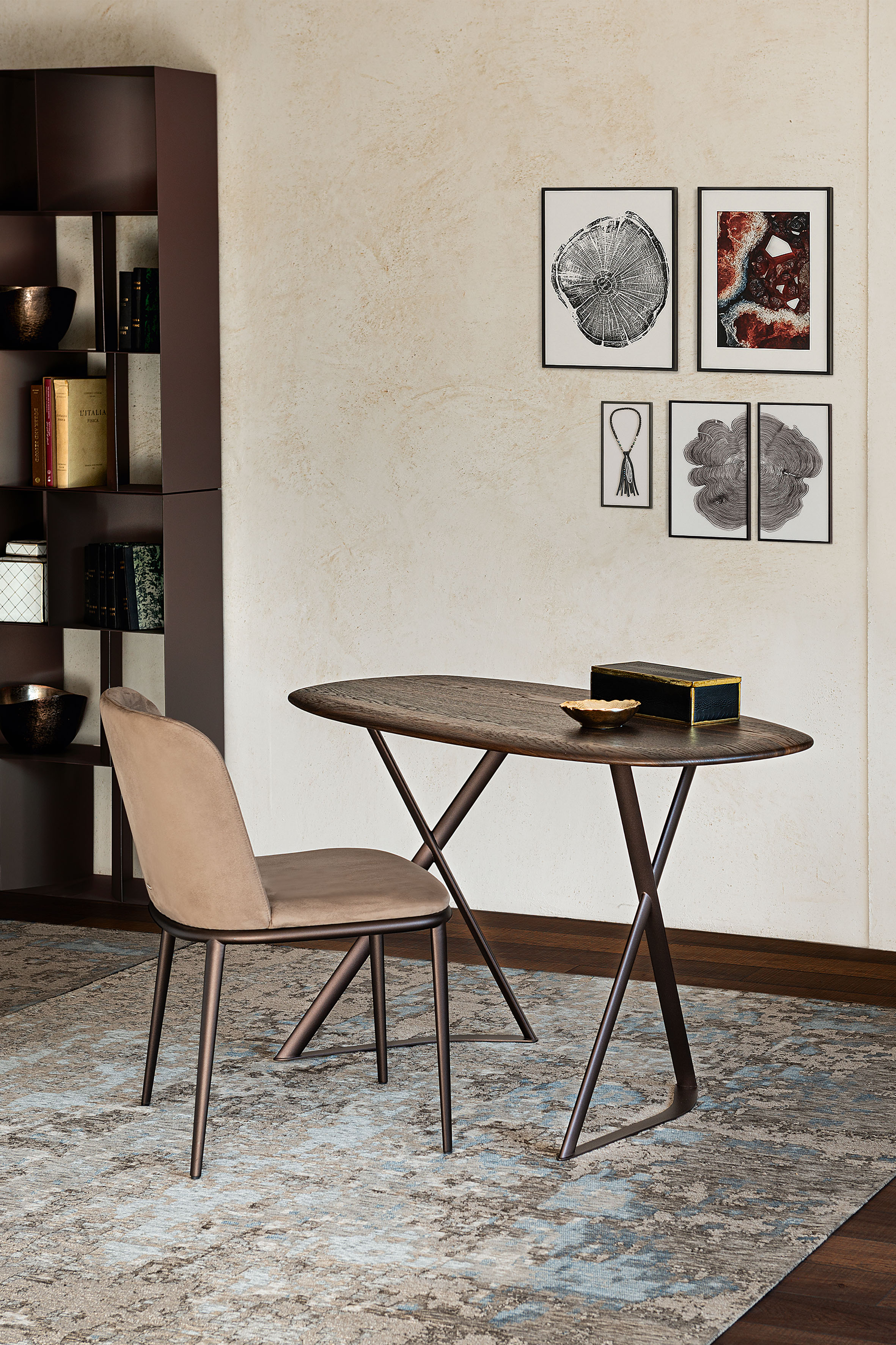 Bureau avec base en acier laqué gaufré titane (GFM11) ou bronze (GFM18). Plateau avec bords arrondis (U) en noyer Canaletto (NC) ou rouvre brulé (RB).