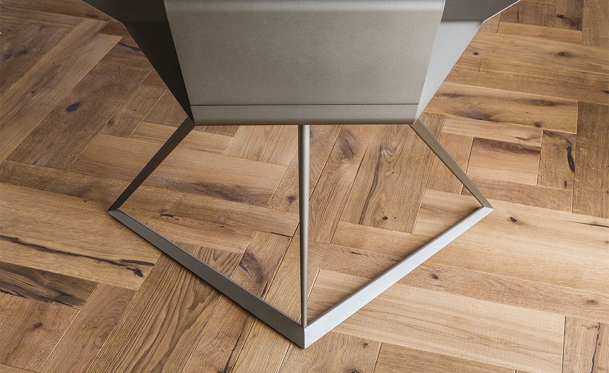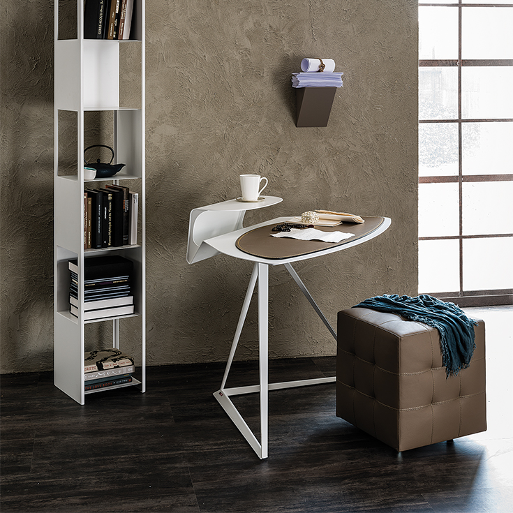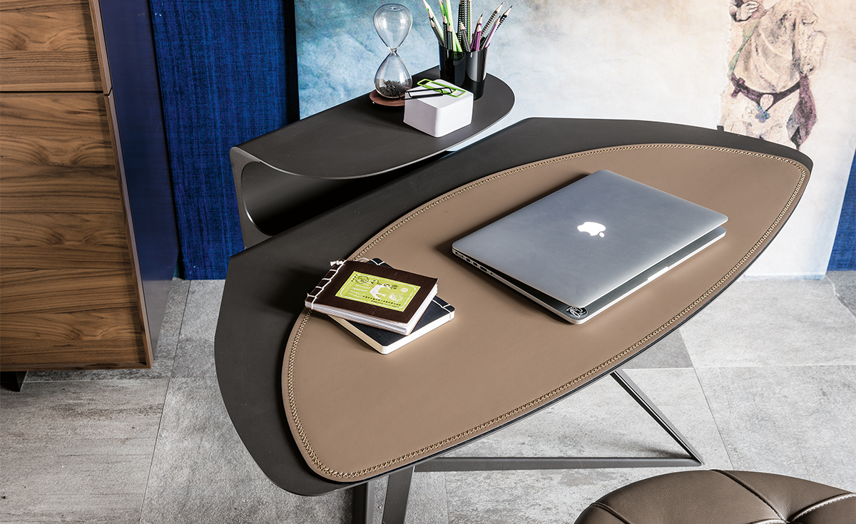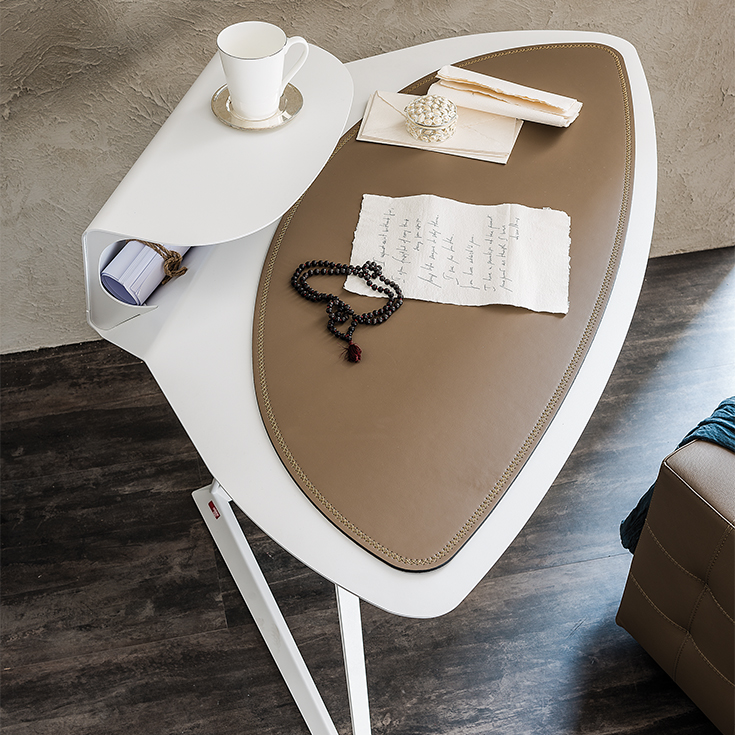 Storm, disegnato da Andrea Lucatello, è uno scrittoio moderno dalle dimensioni ridotte, ideale in un home office o per arredare un angolo lettura. Caratterizzata da linee originali che trasmettono una sensazione di studiato equilibrio. Questa scrivania di design ha una base triangolare su cui poggia un piano curvilineo in acciaio con gola porta oggetti sporgente. Un pad in cuoio disponibile in diversi raffinati colori, completa il piano rendendolo più confortevole ed elegante.