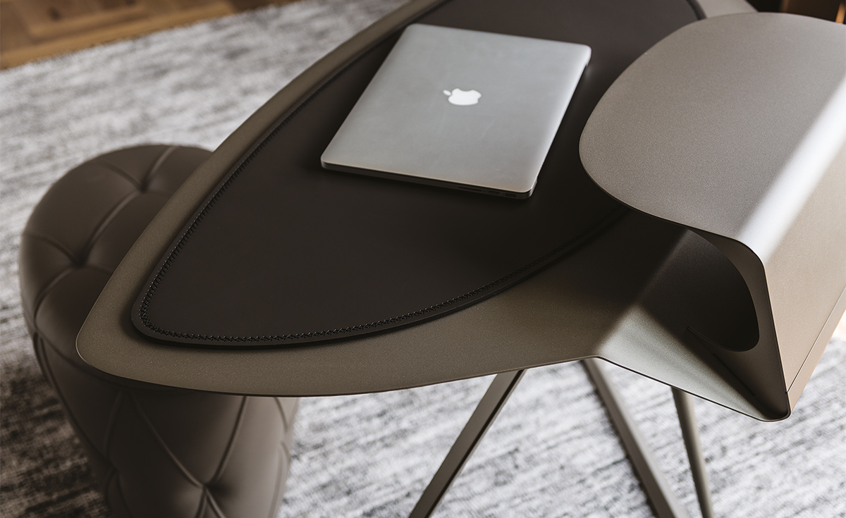 Scrittoio con struttura e piano in acciaio verniciato goffrato titanio (GFM11), bronzo (GFM18), graphite (GFM69) o bianco (GFM71). Pad in cuoio nei colori come da campionario.