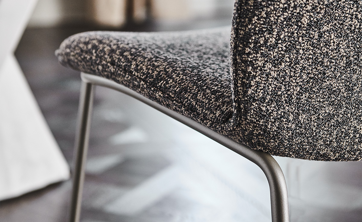 Sedia con struttura in acciaio verniciato goffrato titanio (GFM11), bronzo (GFM18), graphite (GFM69) o nero (GFM73). Rivestimento in tessuto, micro nubuck, ecopelle o pelle come da campionario. Non sfoderabile.