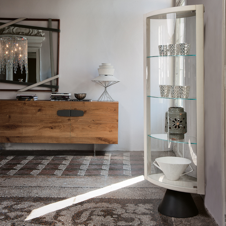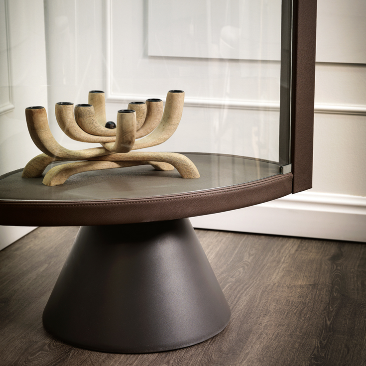 可旋转超透明玻璃陈列柜,材质为Canaletto胡桃木(NC),内部材质为超透明玻璃搁板。底座材质为石墨色压纹漆钢(GFM69),LED灯。最大容量:每块层板7公斤。