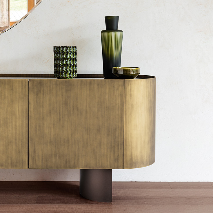 Sideboard with wood frame covered in bronze (GFM18) or Oxybrass embossed lacquered steel. Top in bronze mirrored glass or in ceramic Marmi matt Golden Calacatta (KM05), glossy Golden Calacatta (KM06), matt Portoro (KM07), glossy Portoro (KM08), Breccia (KM12), Colosseo (KM21) or Taj Mahal (KM26). Feet in bronze (GFM18) embossed painted steel. Internal shelves.