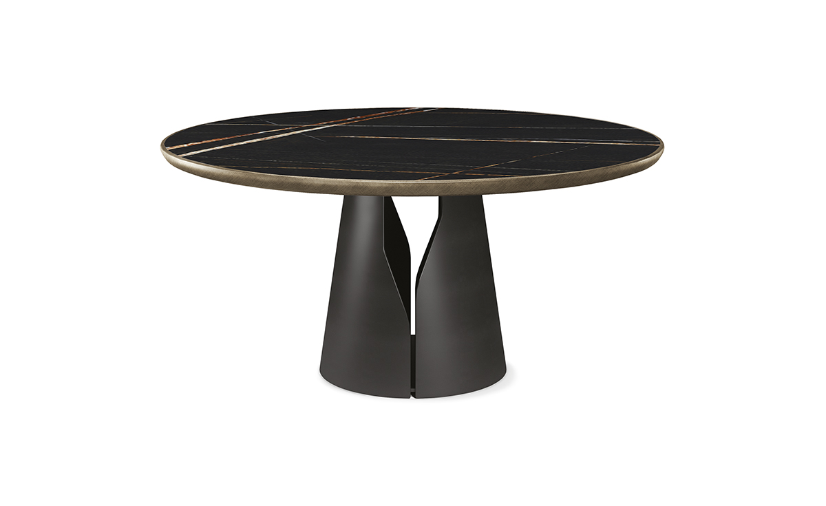 Esstisch mit Basis aus Metall lackiert titan (GFM11), bronze (GFM18), graphit (GFM69), pearl (GFM70) oder schwarz (GFM73) gaufriert. Platte aus Keramik Marmi in den Farben Alabastro (KM02), matt Golden Calacatta (KM05), glänzend Golden Calacatta (KM06), matt Portoro (KM07), glänzend Portoro (KM08), glänzend Sahara Noir (KM09), Makalu (KM11), Breccia (KM12), Borghini Calacatta opaco (KM18), Colosseo (KM21), Andromeda (KM22), matt Invisible (KM24) oder Luxor (KS23) mit Brushed Bronze oder Brushed Grey lackiertem abgerundetem Profil. Farb- und Bürstenwechsel der Brushed Ausführung sind charakteristisch für die Handarbeit und gelten nicht als Defekte.