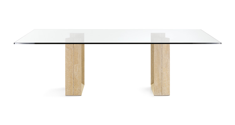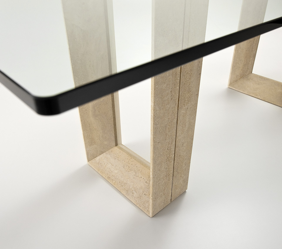 Tisch mit Beinen aus Travertin (TN) oder weiß Carrara Marmor (BC). Klar Glasplatte 15mm. Die Platte ist auf der Basis aufgelegt.