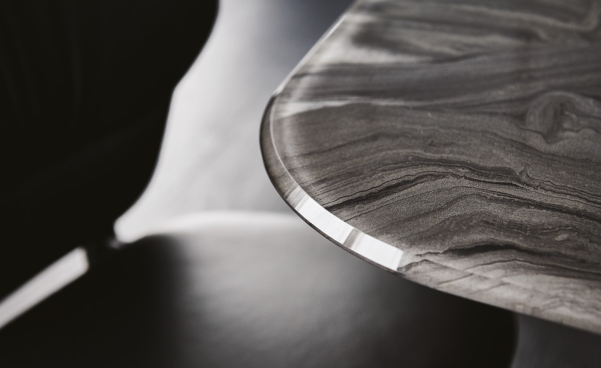 Tisch mit Basis aus Stahl lackiert titan (GFM11), bronze (GFM18), graphit (GFM69) oder schwarz (GFM73) gaufriert. Füße in schwarz Chrom (06). 12 mm Glasplatte extra hell facettiert mit schmückendem Kunstdruck in zwei Farbvarianten (CY01, CY02).