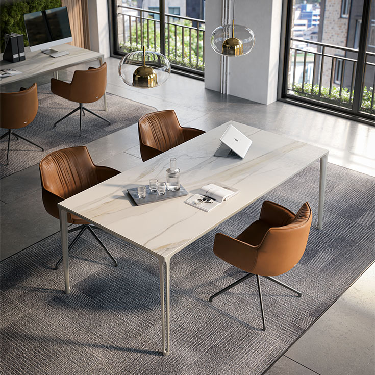 Das Modell Rhonda Cantilever hingegen verfügt über die für die Linie der Cantilever-Stühle typische Freischwingerstruktur aus einem einzigen Stahlrohr. Eine funktionellere oder bürofreundlichere Variante ist Rhonda Turn, die Version dieses Design-Drehstuhls mit einem Fußkreuz mit vier Speichen.