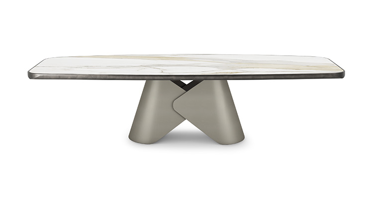Tisch mit Basis aus Stahl lackiert titan (GFM11) oder bronze (GFM18) gaufriert. Platte aus Keramik Marmi in den Farben Alabastro (KM02), matt Golden Calacatta (KM05), glänzend Golden Calacatta (KM06), matt Portoro (KM07), glänzend Portoro (KM08), glänzend Sahara Noir (KM09), Makalu (KM11), Breccia (KM12), matt Borghini Calacatta (KM18), glänzend Borghini Calacatta (KM19), Andromeda (KM22), matt Invisible (KM24) oder Luxor (KS23) mit Brushed Bronze oder Brushed Grey lackiertem abgerundetem Profil. Die Platte 300x128 ist 6 cm dick, die Platte 240x120 ist 5 cm dick. Farb- und Bürstenwechsel der Brushed Ausführung sind charakteristisch für die Handarbeit und gelten nicht als Defekte.