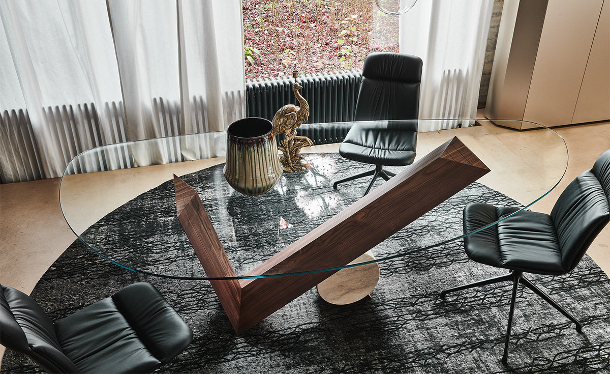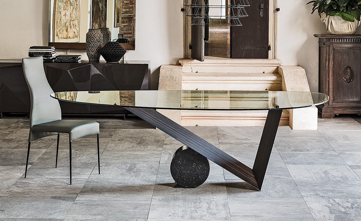 Emanuele Zenere hat den Tisch Valentino zum ersten Mal 1991 gezeichnet. Seitdem hat sich die Produktfamilie zunächst um den Tisch Valentinox und später um 2 Versionen der gleichnamigen Konsole erweitert. Die skulpturale Basis stellt ein Gleichgewicht von Volumen da, die sich gegenseitig zu unterstützen scheinen, während die Glasplatte dieser Kombination verschiedener Materialien Licht und Prominenz verleiht. Im ursprünglichen Design dieses modernen Esstisches, das später mit der Holzkonsole Valentino aufgegriffen wurde, besteht das V-förmige Hauptvolumen aus edlen Holzarten und ruht auf einem Marmorzylinder. Bei der Konsole Valentinox und beim gleichnamigen Glastisch besteht das Hauptvolumen stattdessen aus poliertem Edelstahl.