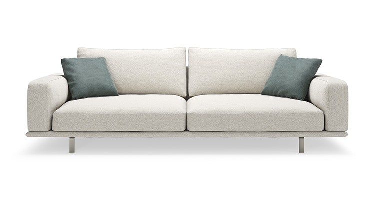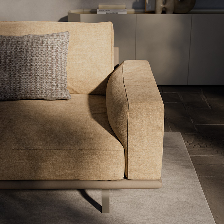 Einzelsofa oder kombienierbares Sofa mit Holzgestell, Sitzpolsterung aus Polyurethan und Rückenpolsterung aus Daunen, Füße aus lackiertem Metall in Titan (GFM11), Bronze (GFM18) oder Schwarz (GFM73), in zwei Höhen erhältlich. Bezug aus Stoff oder Leder laut Musterkollektion. Version mix: Teil "A" mit Bezug aus Stoff oder Softleder laut Musterkarte. Teil "B" mit Bezug aus Glove Softleder. Bezug nur in der Stoffversion abnehmbar.