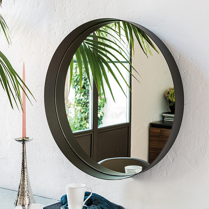 Wandspiegel in Glas verspiegelt. Rahmen in Metall lackiert titan (GFM11), graphit (GFM69) oder schwarz (GFM73) gaufriert, Brushed Bronze oder Brushed Grey.