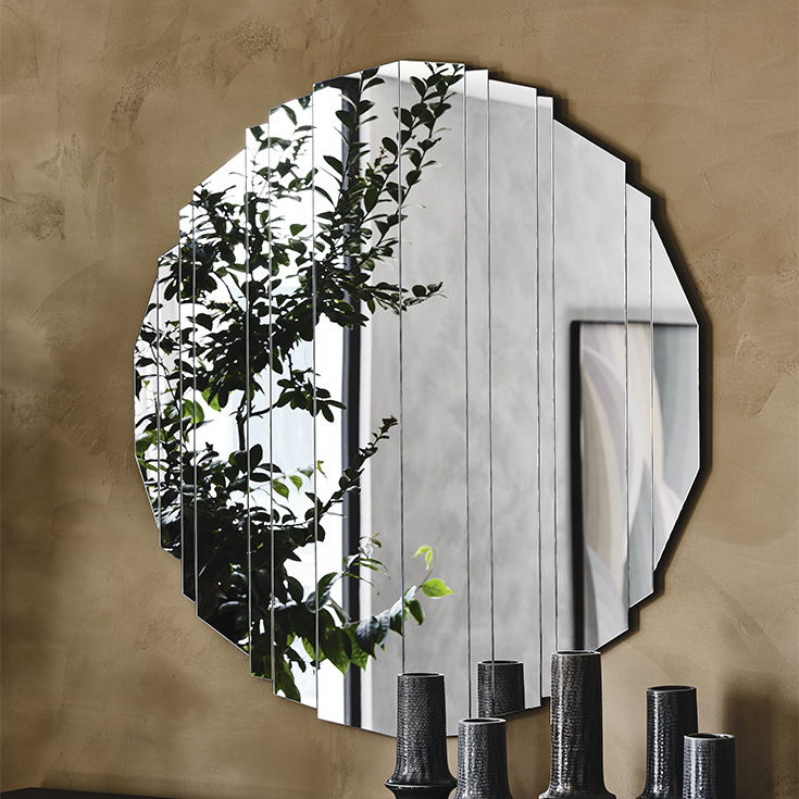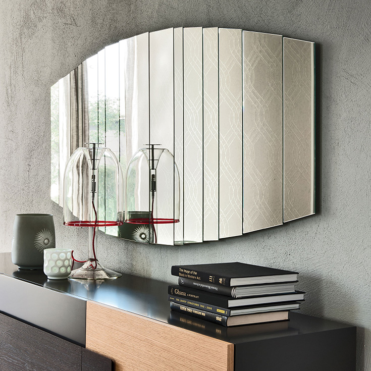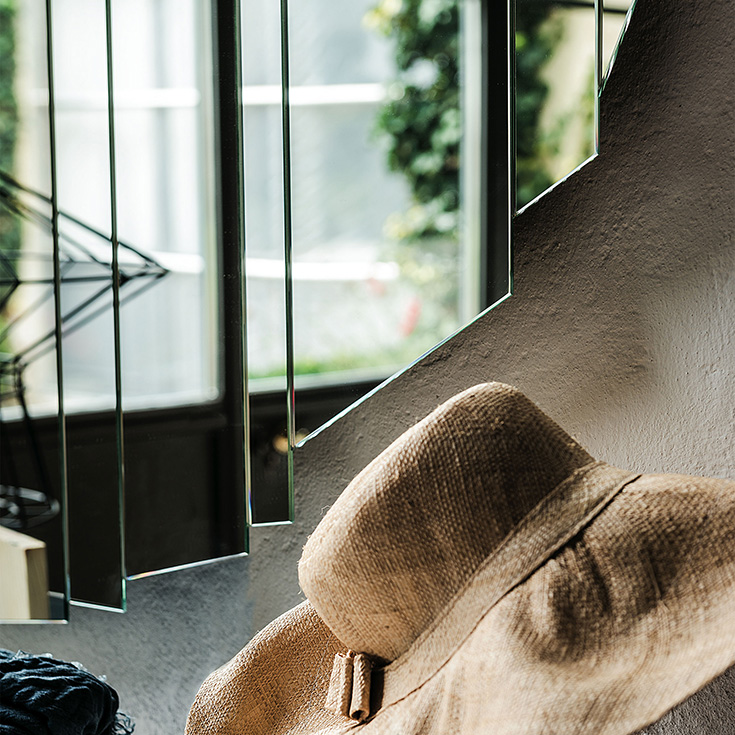 Der Designerspiegel Stripes ist ein kühnes Accessoire, das der Wand Rhythmus und Volumen verleiht. Dieser moderne Spiegel besteht aus verspiegelten Glasstreifen, die nebeneinander platziert sind und die Reflexion brechen. Dadurch entsteht ein origineller optischer Effekt, der den Raum illusorisch vergrößert. Paolo Cattelan hat den Spiegel Stripes in zwei Formen konzipiert, beide mit gezackten Kanten: ein runder Spiegel und ein horizontaler Spiegel mit elliptischer Form, wie ein wohlwollendes Auge, das die Grenzen des Raumes über die Wand hinaus erweitert.
