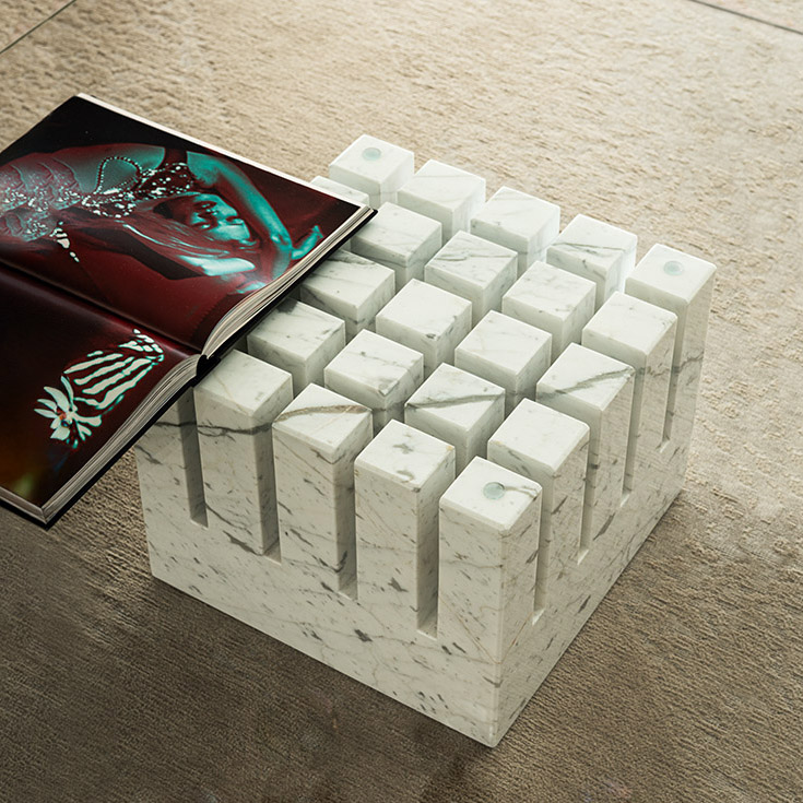 Scacco ist eines der langlebigsten und ikonischsten Produkte des Unternehmens. Ein Glas-Couchtisch für das Wohnzimmer mit prägnantem skulpturalem Charakter, der zum unbestrittenen Protagonisten in einem Design-Wohnzimmer wird. Der sensationelle quadratische Marmorsockel, der mit den besten Techniken Made in Italy bearbeitet wurde, bietet ein dreidimensionales geometrisches Design, das durch die Glasplatte wunderbar sichtbar ist. Tatsächlich ermöglicht die transparente Platte des Glastischs den Blick auf den kostbaren Sockel in seiner Gesamtheit.