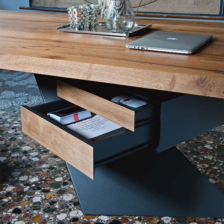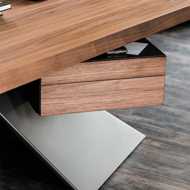 Schreibtisch mit Schubladen aus Nussbaum Canaletto (NC), Eiche Heritage (HR) oder Ulme offenporig lackiert schwarz matt (OLM73). Bein aus Metall lackiert graphit (GFM69), titan (GFM11) bronze (GFM18) gaufriert, Struktur und Schubladenelement aus Holz lackiert sind mit dem Bein gleichfarbig. Pad in Kernleder, Farbe laut Musterkarte. In der Version 215x100 kann die Schublade in beiden Seiten des Schreibtisches befestigt werden, in der Version 260x120, nur in der kürzeren Seite.