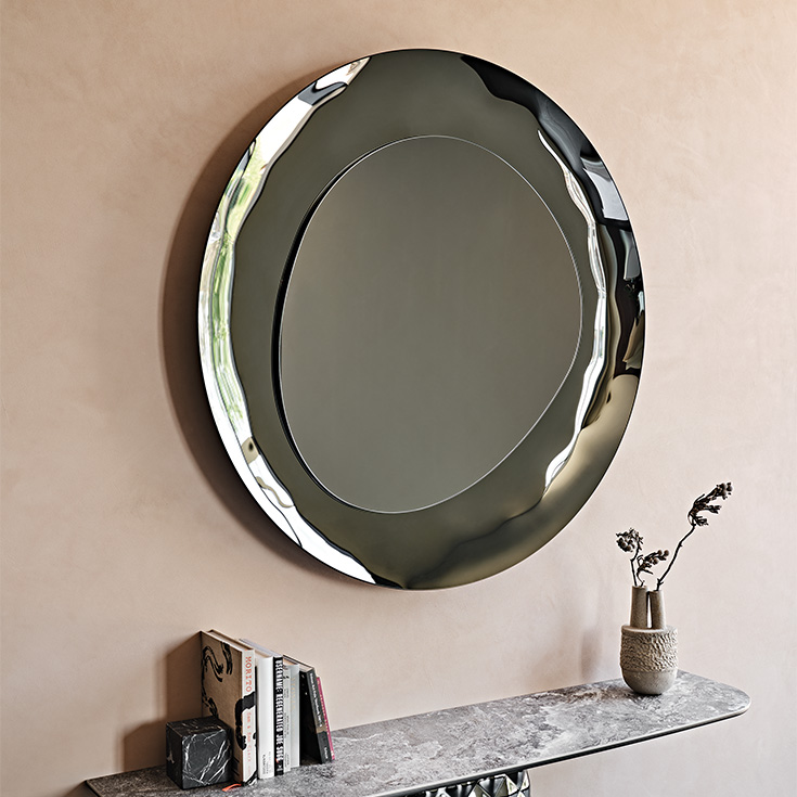 Cosmos besteht aus zwei verschiedenen Elementen. Der zentrale, verspiegelte Teil mit seinen unregelmäßigen Konturen scheint freihändig und instinktiv gezeichnet zu sein und schafft damit einen besonders natürlichen Effekt. Die Außenkante, die sich auf einer Ebene darunter befindet, ist hingegen leicht konkav. Die Oberfläche reflektiert die Umgebung nicht scharf, nutzt aber die Helligkeit der Umgebung, um den dekorativen Rahmen mit einem flüssigen, wechselnden optischen Effekt perfekt zur Geltung zu bringen.