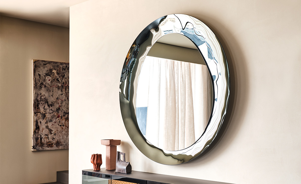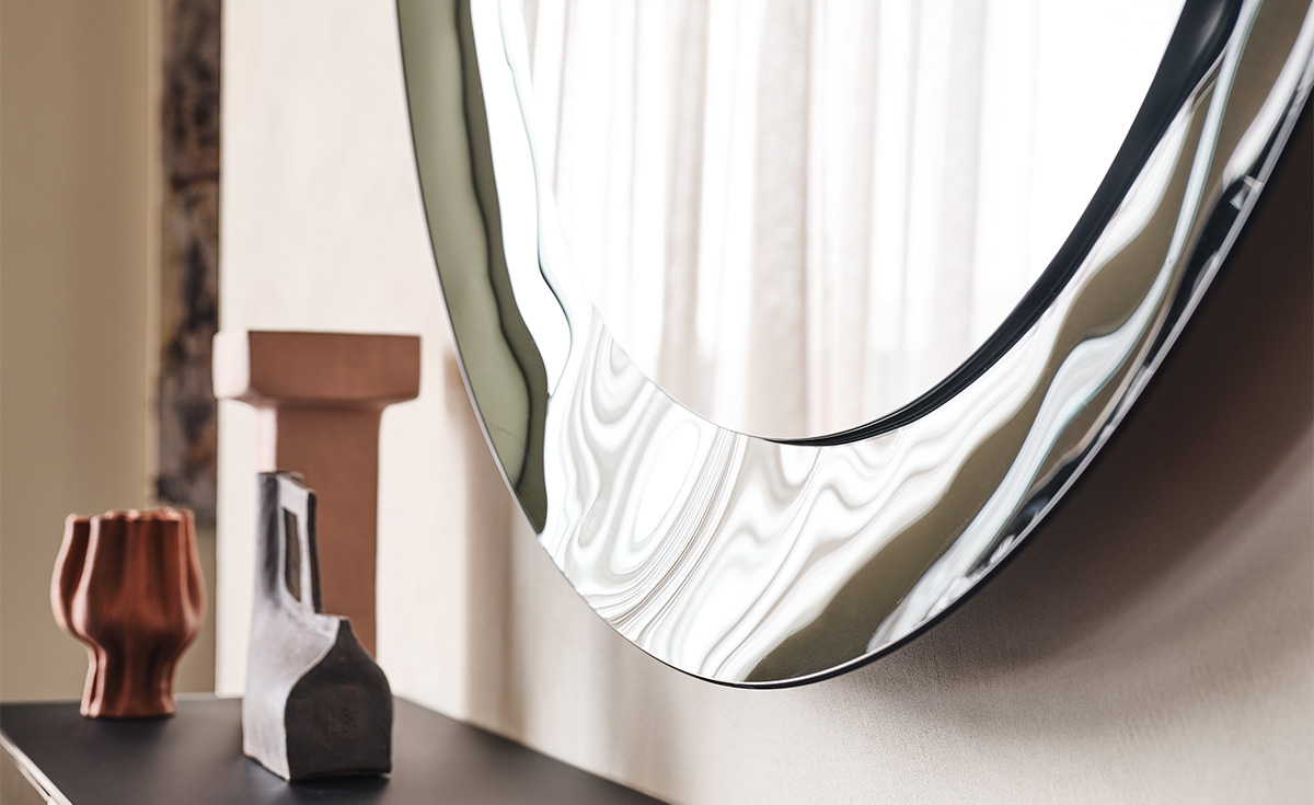 Das Ergebnis ist ein moderner Spiegel mit einer weichen, fließenden Form, die den Raum zu umhüllen scheint.