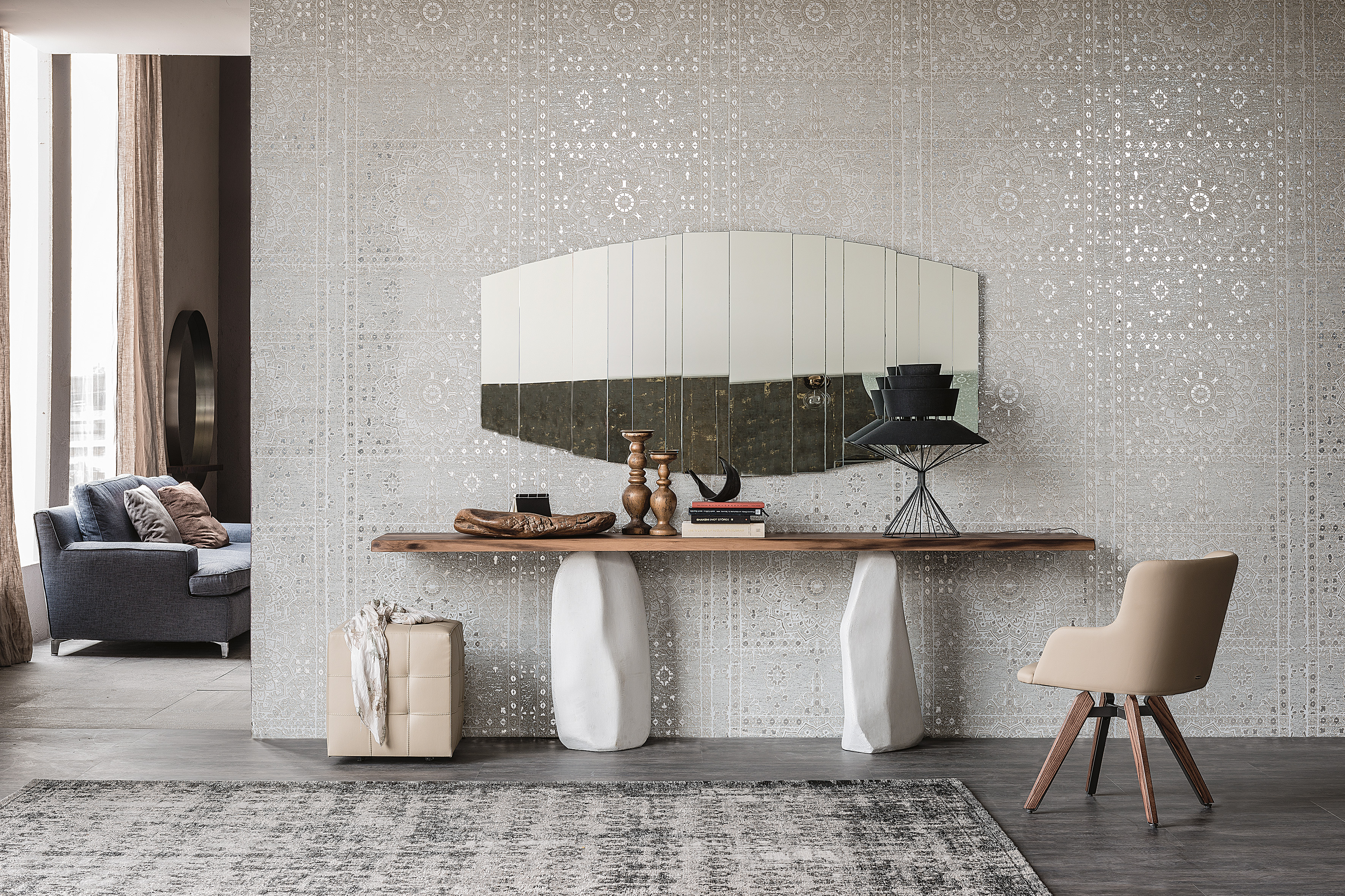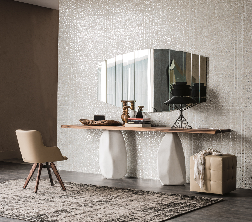 Der Holzkonsolentisch Rapa Nui ist eine elegante Kombination aus naturalistischer Inspiration und hochwertigen Produktionstechniken. Die Platte aus edlem Massivholz scheint prekär auf der unregelmäßigen Basis zu ruhen, die von zwei Monolithen gebildet wird. Die unregelmäßigen Kanten verleihen dieser modernen Konsole eine angenehme Haptik und Materialwirkung und bringen sie einer naturalistischen Ästhetik näher.