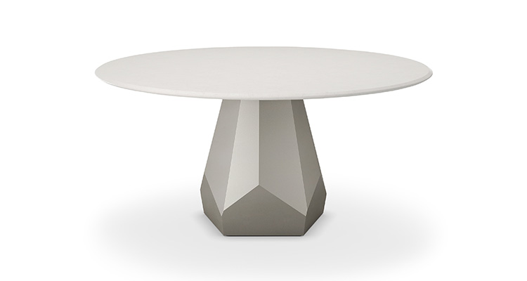 Die Tischfamilie Zermatt zeichnet sich durch einen zentralen Sockel aus, der reich an Ecken und Kanten ist. Genau genommen besteht er aus 15 Flächen, die sich mit geometrischer Präzision um die zentrale Säule wiederholen. Jede Seite dieses Prismas scheint eine andere Farbe zu haben, da sie das Licht je nach Winkel unterschiedlich stark reflektiert.