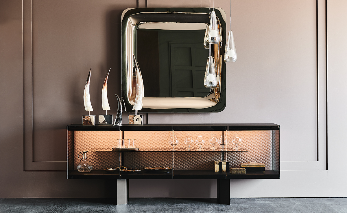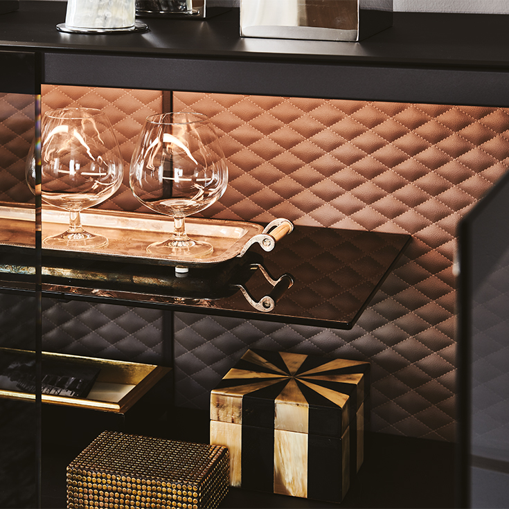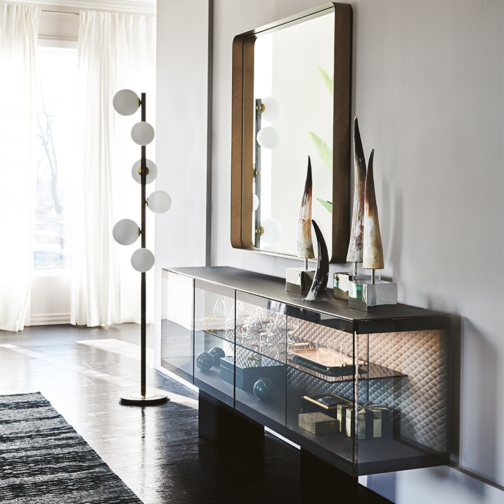 Die kostbarsten Objekte werden im edlen Sideboard Boutique gleichzeitig präsentiert und aufbewahrt. Die internen Kristallböden, die mit gestepptem Leder überzogene Rückenlehne und die LED-Leuchten zielen in ihrer Gesamtheit darauf ab, Aufbewahrtes in dem Möbelstück zur Aufbewahrung hervorzuheben und den Wohnbereich mit raffiniertem Geschmack auszustatten. Die Kollektion von Designeranrichten besteht aus zwei Versionen mit 4 Türen, mit unterschiedlichen Höhen und einem Sideboard, Boutique Alta, mit 3 Regalen.