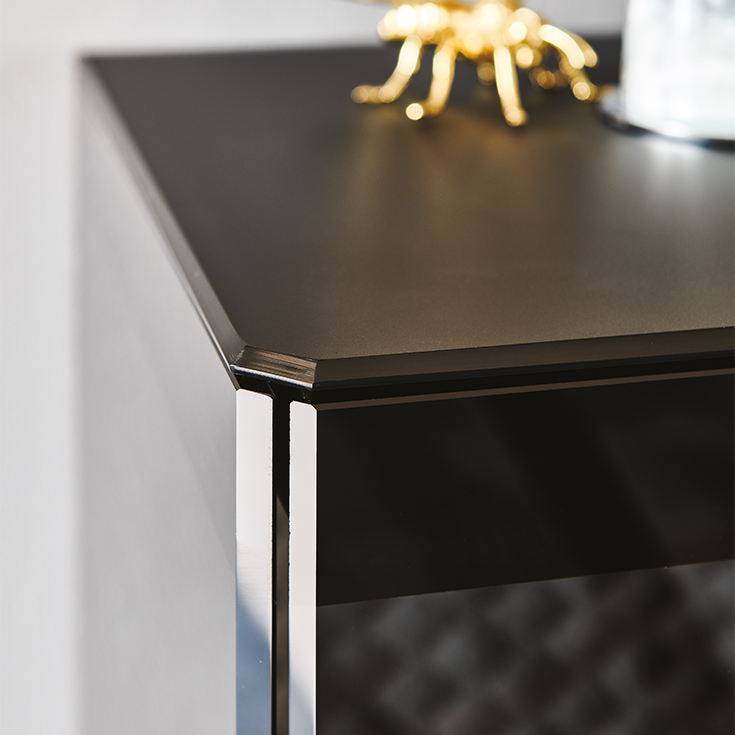 Anrichte mit Struktur und Füße in Stahl lackiert schwarz (GFM73) gaufriert, Türen und Seiten in Glas fumé mit Blende in Glas lackiert schwarz. Top und Boden in Glas lackiert schwarz geätzt. Innere Rückwand in Kunstleder oder Softleder gesteppt laut Musterkarte. Innenboden aus Glas fumé. LED-Beleuchtung enthalten.