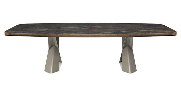Esstisch mit Basis aus Stahl lackiert titan (GFM11), bronze (GFM18), graphit (GFM69) oder schwarz (GFM73) gaufriert, Brushed Bronze oder Brushed Grey. Platte aus Keramik Marmi in den Farben Alabastro (KM02), matt Golden Calacatta (KM05), glänzend Golden Calacatta (KM06), matt Portoro (KM07), glänzend Portoro (KM08), glänzend Sahara Noir (KM09), Makalu (KM11), Breccia (KM12), Borghini Calacatta opaco (KM18), Borghini Calacatta lucido (KM19), Colosseo (KM21), Andromeda (KM22), matt Invisible (KM24) oder Luxor (KS23) mit Brushed Bronze oder Brushed Grey lackiertem abgerundetem Profil. Die Platte 300x128 ist 6 cm dick, die Platte 240x120 ist 5 cm dick. Farb- und Bürstenwechsel der Brushed Ausführung sind charakteristisch für die Handarbeit und gelten nicht als Defekte.