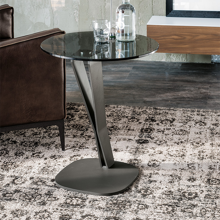Der Beistelltisch Falco ist ein praktisches Möbelstück zur Ausstattung eines funktionalen Design-Wohnzimmers. Falco besteht aus einem auf einem Sockel ruhenden Bein, beides aus Stahl. Das Bein, das aus einem Paar geformter Platten besteht, ist von einem industriellen Stil inspiriert, der jedoch durch die Platte aus raffiniertem transparentem oder rauchfarbenem Glas verziert wird. Dadurch entsteht ein angenehmer Stilkontrast. Dieser runde Couchtisch aus Glas ist eine vielseitige und anspruchsvolle Lösung, ideal neben einem Sofa oder Sessel, um Ihre Gegenstände bequem in Reichweite zu halten.