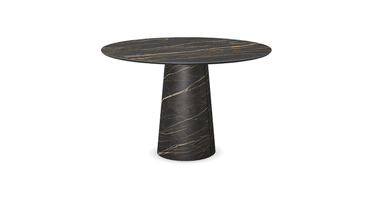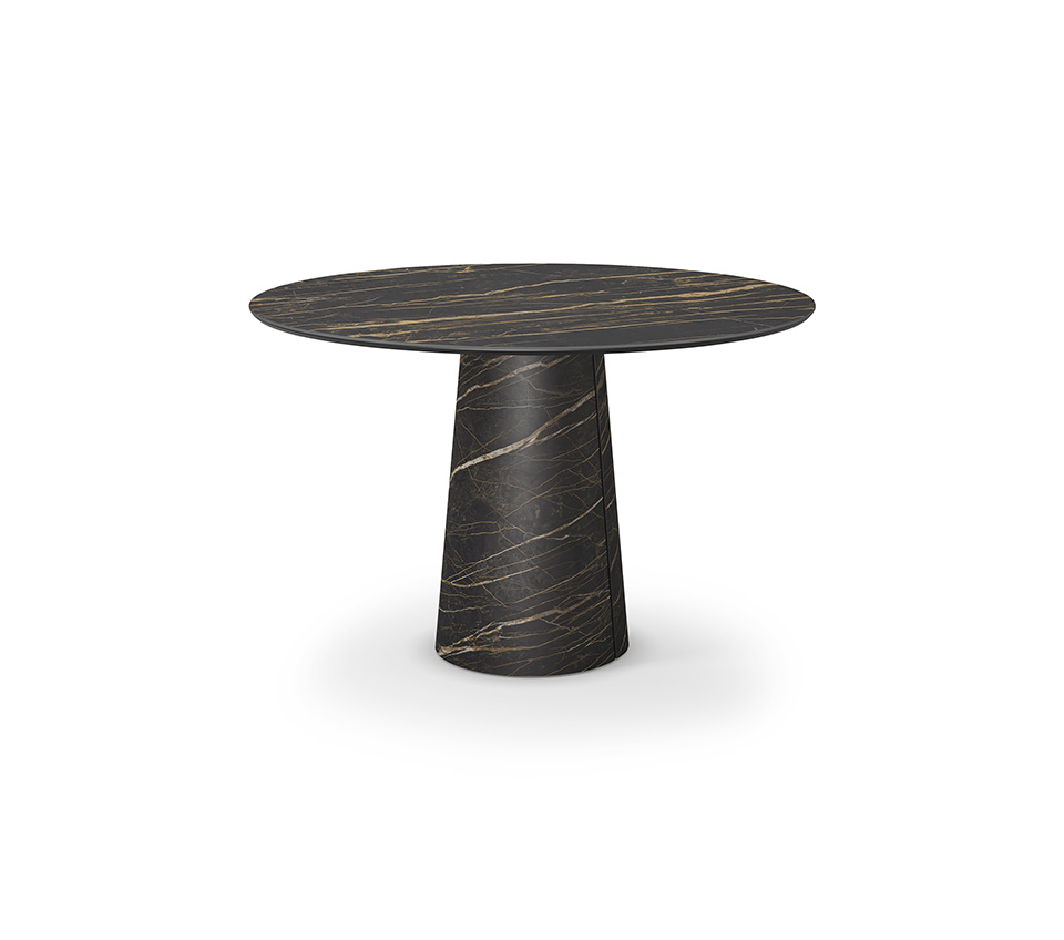 Esstisch mit Platte und Basis aus Keramik Marmi in den Farben matt Portoro (KM07), matt Borghini Calacatta (KM18), Colosseo (KM21) oder matt Invisible (KM24). Farbvariationen und Formunregelmäßigkeiten der Basis sind Eigenschaften der speziellen Verarbeitung des Materials und sind nicht als Fehler zu betrachten.