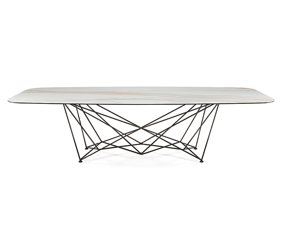 Die Familie moderner Tische Gordon, entworfen von Giorgio Cattelan, erscheinen wie sich chaotisch kreuzende geometrische Linien, die jedoch mit Ordnung und planvoll eine perfekte Symmetrie zum Leben erwecken. Noch deutlicher wird dieses Spiel im Modell des runden Glastisches, das Tischdesign ist aber auch in Keramik erhältlich, bei dem man von oben betrachtet die Form eines dreidimensionalen Sterns erkennen kann. Die Versionen Gordon und Gordon Crystalart verfügen beide über eine Kristallplatte, die letztere ist mit einem dekorativen Kunstdruck verziert. Darüber hinaus werden die Varianten Gordon Deep Wood mit Holzplatte mit unregelmäßigen Kanten von majestätischer und imposanter Erscheinung oder Gordon Keramik in Marmi Keramik in zahlreichen eleganten Farbtönen gefertigt.