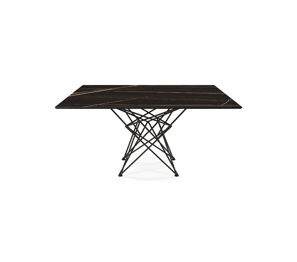 Esstisch mit Basis aus Stahl lackiert titan (GFM11), graphit (GFM69) oder schwarz (GFM73) gaufriert. Platte in Keramik Marmi in den Farben Alabastro (KM02), matt Golden Calacatta (KM05), glänzend Golden Calacatta (KM06), matt Portoro (KM07), glänzend Portoro (KM08), glänzend Sahara Noir (KM09), Makalu (KM11), Breccia (KM12), Corcovado (KM14), Kaindy (KM16), matt Borghini Calacatta (KM18), glänzend Borghini Calacatta (KM19), Colosseo (KM21), Andromeda (KM22), matt Invisible (KM24) oder Luxor (KS23). Die Platte ist auf der Basis aufgelegt. Optional drehbares Tablett Lazy Susan.