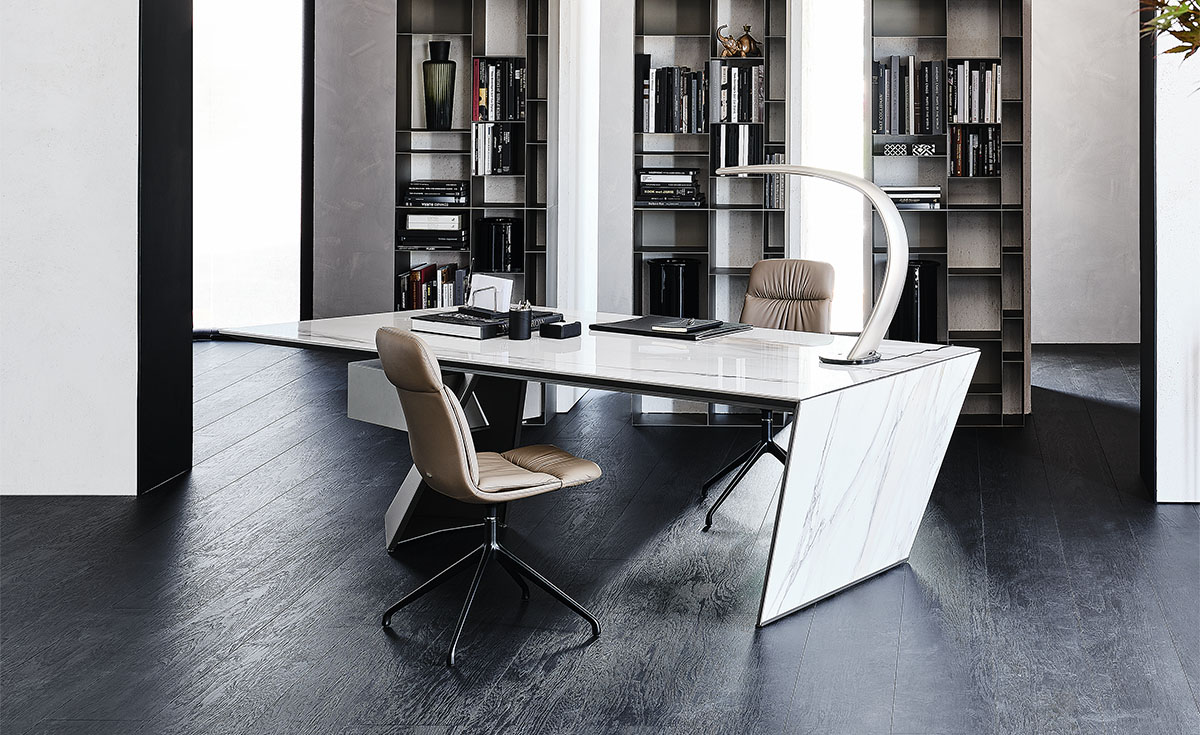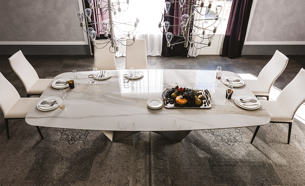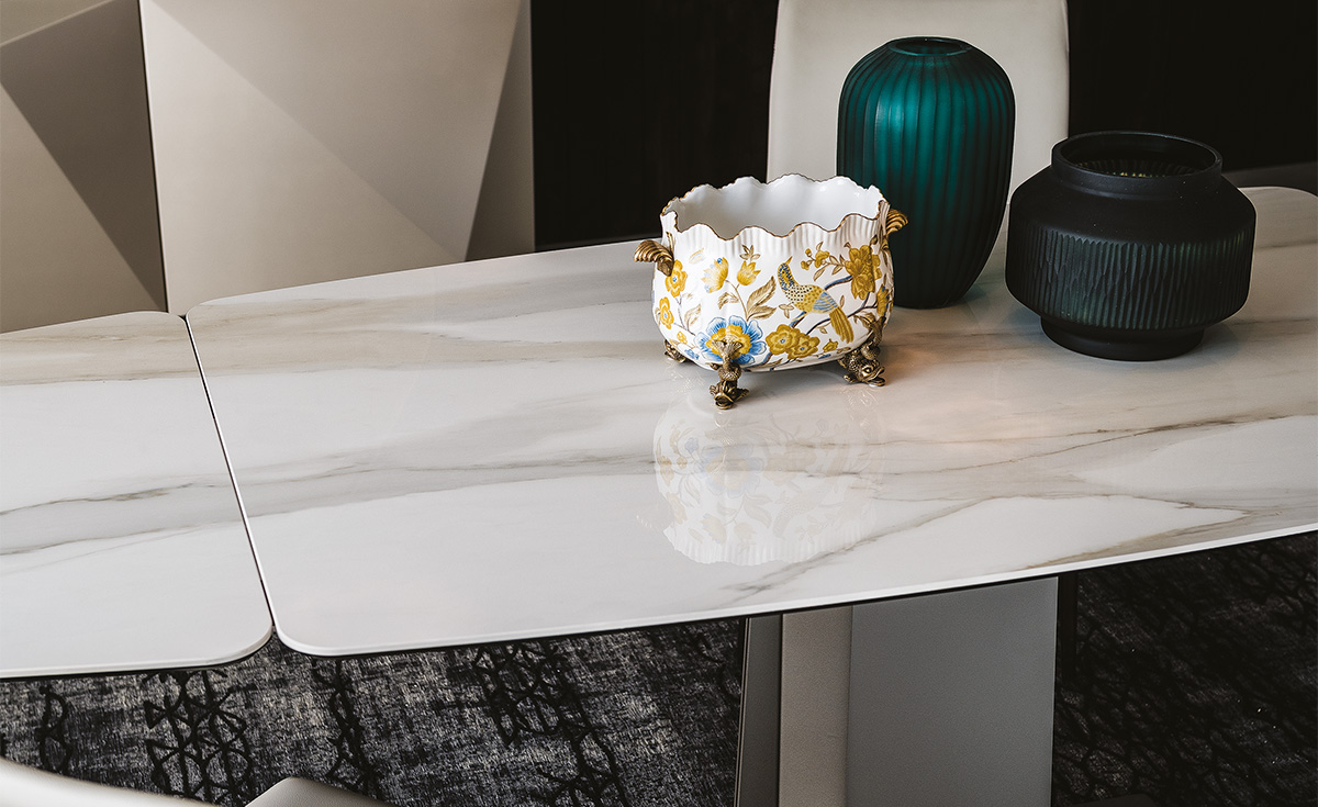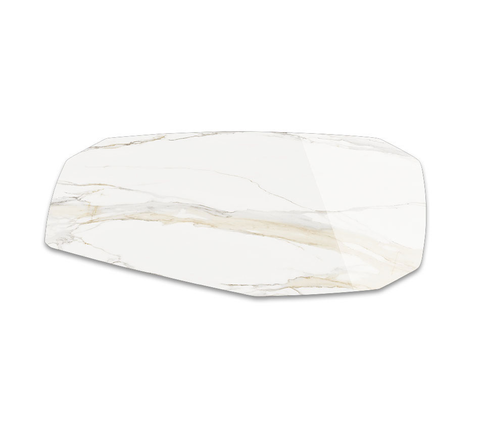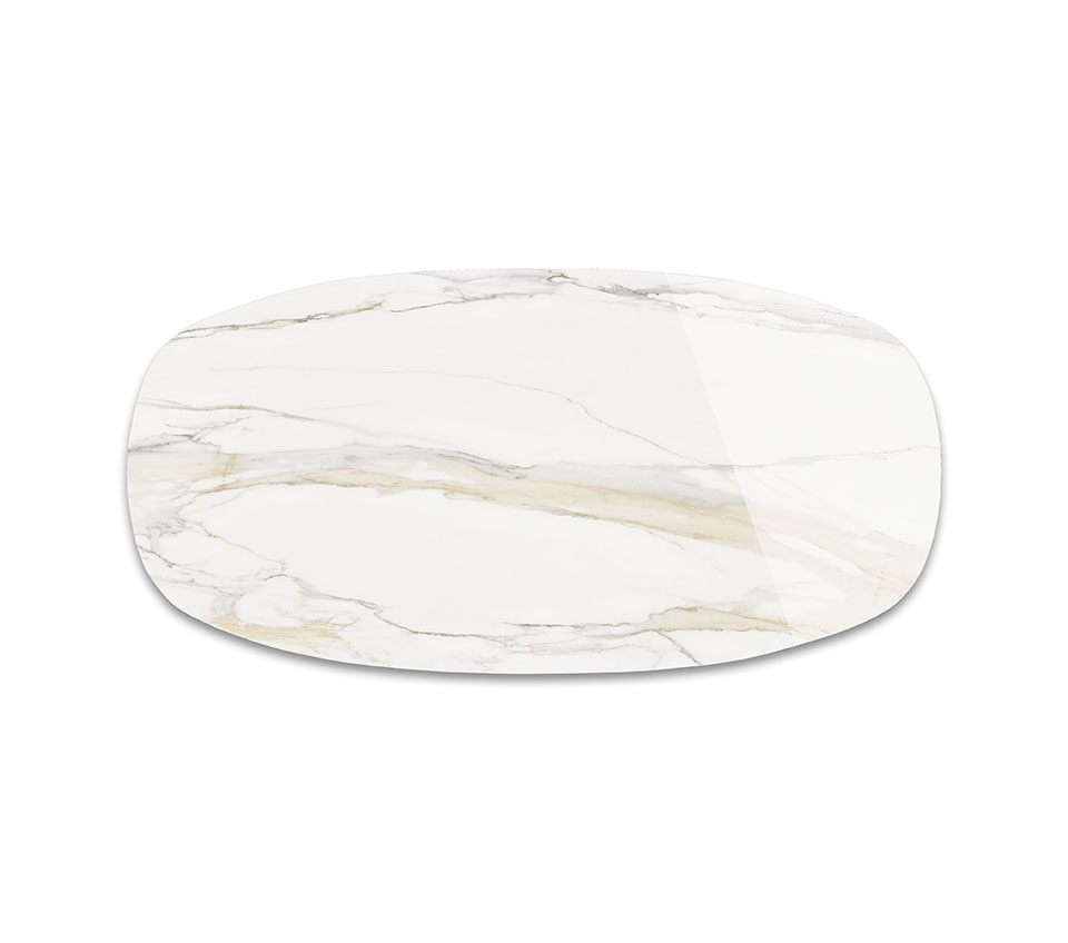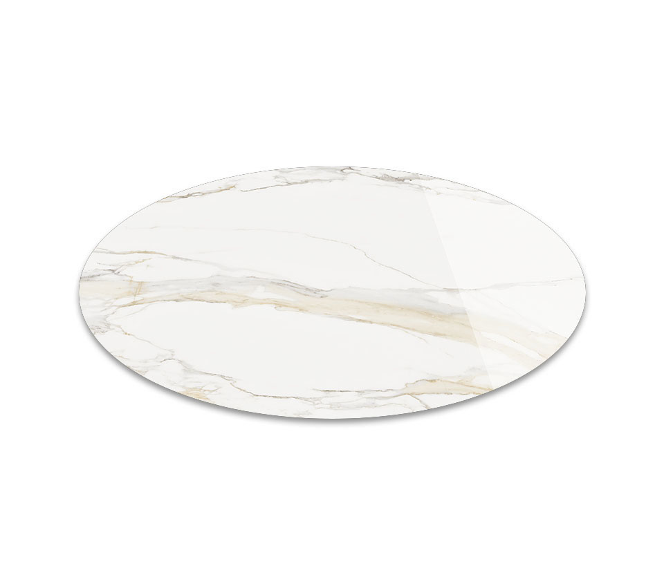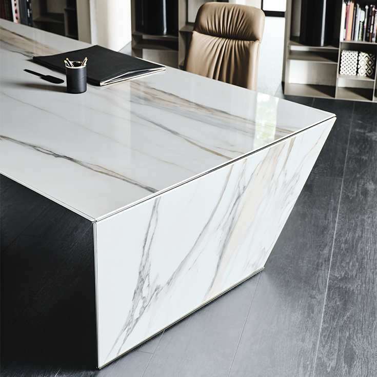 The jewel of our fine Italian marbles that are used to create captivating designer marble furniture, the Golden Calacatta marble is an essential part of our Keramik collection of natural marble-effect ceramics.The luxurious Golden Calacatta finish has a light, milky background with thick soft veins ranging from yellow to light grey and is available in the Glossy and Matt versions. Gentle coloured trails run the length of the slab, giving it a long and elegant appearance. This finish is often combined with sumptuous details or balanced by cold metallic tones. In a modern living room a Golden Calacatta designer table achieves a glamorous and luxurious effect, coupled with the natural elegance of marble. Our range of modern ceramic furniture also includes refined cabinets, console tables and spectacular ceramic coffee tables, as well as desks with ceramic tops to create lovely home offices.