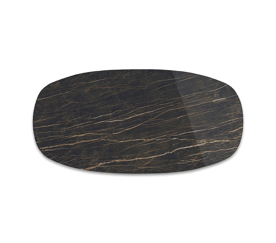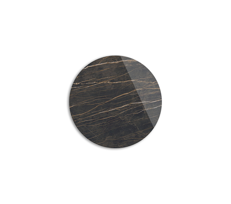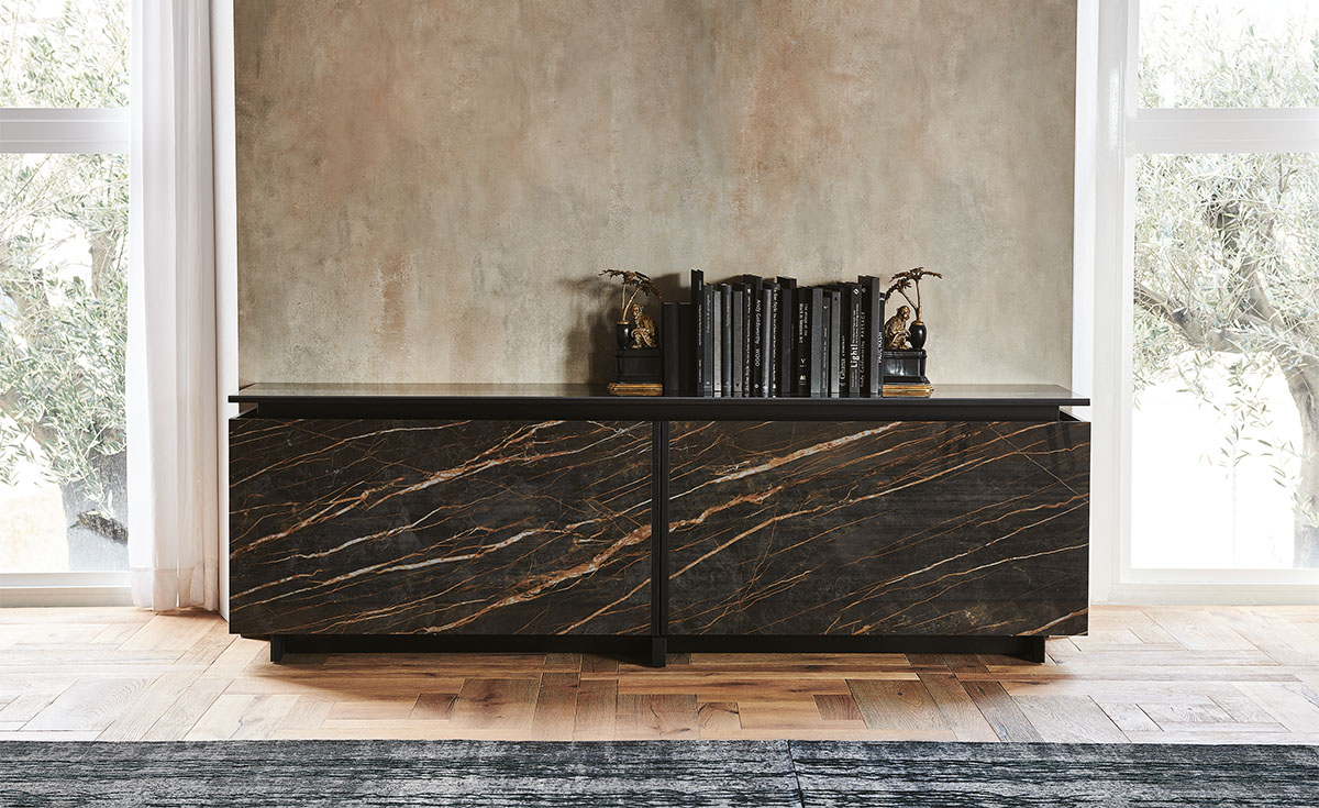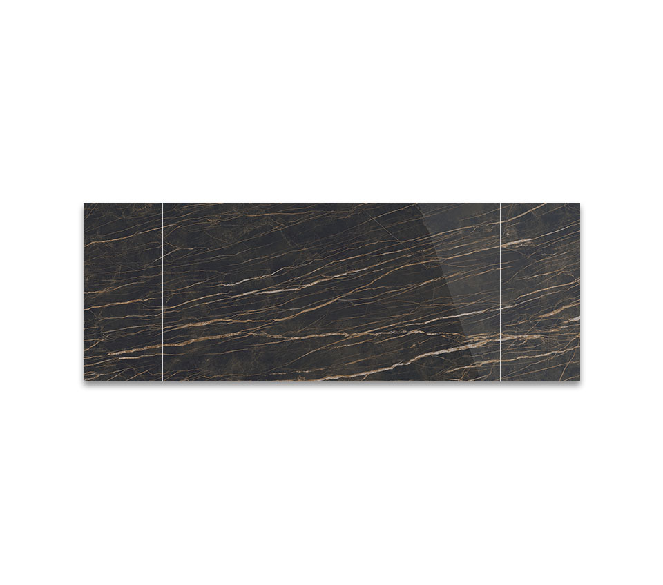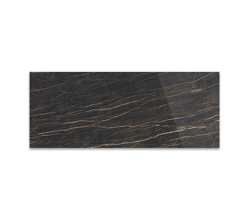 The Portoro marble-effect ceramic meticulously replicates the exquisite stone of the same name that is extracted from the Ligurian quarries in northern Italy. Its name comes from the area where the largest quarries are located. Initially called Portovenere marble, it was later renamed Port d 'Or during the French occupation and finally translated into Italian as Porta d 'Oro, to become Portoro, a name by which it is now known all over the world. Its texture stands out for the dark and intense base and the warm veins that look like lively brushstrokes. This ceramic is available in the Glossy and Matt versions. The top of a table or desk in Portoro adds a refined and classic touch to a room; a designer ceramic cabinet with its scattered and contrasting veins, makes it possible to decorate a wall in the same way as with a contemporary work of art; or again, a mixture of ceramic coffee tables with different heights and sizes allows you to create your own personal pattern by placing ceramic slabs with different striations side by side.