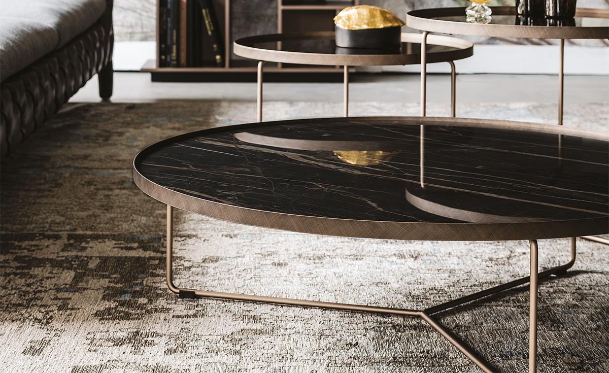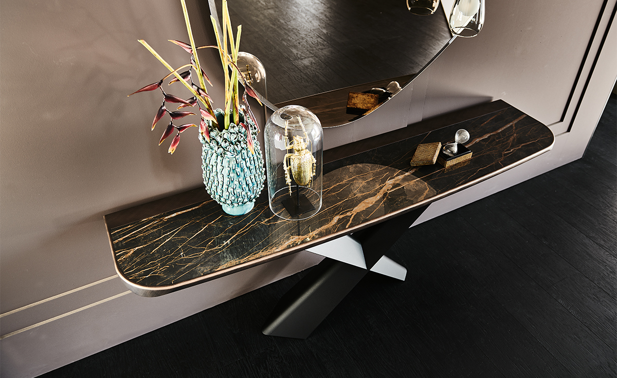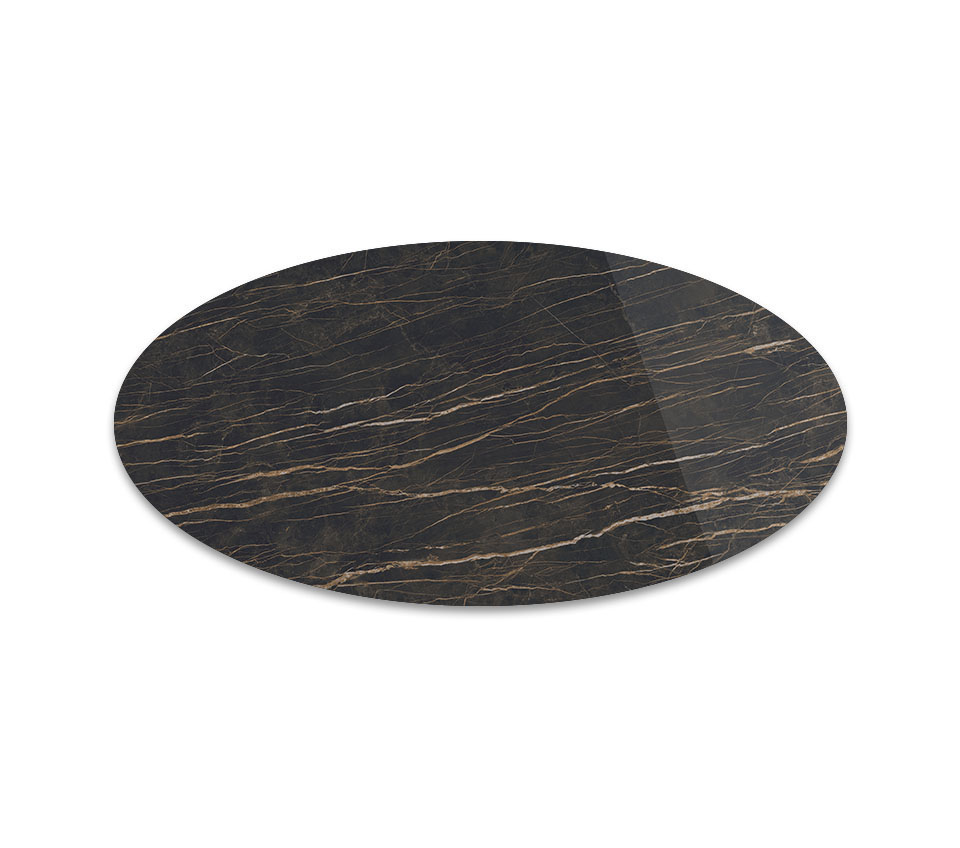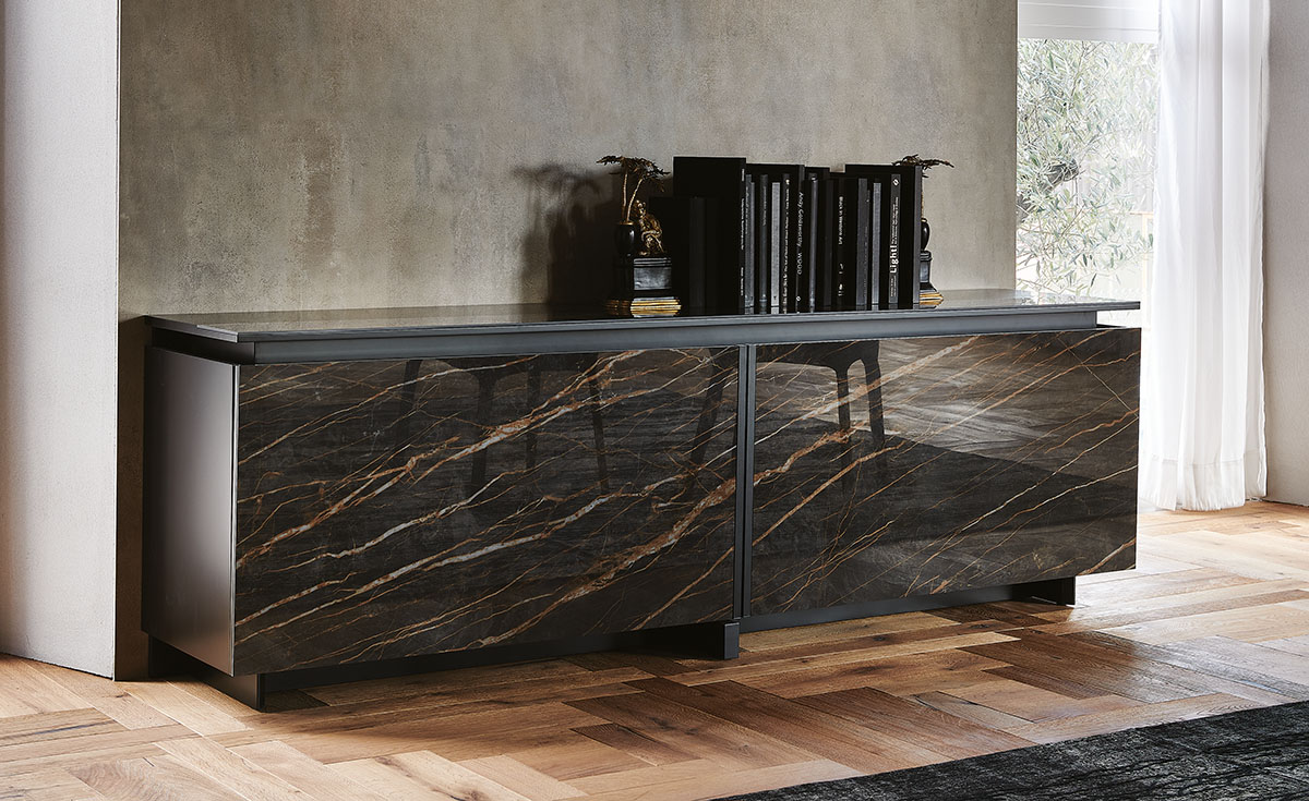 The Portoro marble-effect ceramic meticulously replicates the exquisite stone of the same name that is extracted from the Ligurian quarries in northern Italy. Its name comes from the area where the largest quarries are located. Initially called Portovenere marble, it was later renamed Port d 'Or during the French occupation and finally translated into Italian as Porta d 'Oro, to become Portoro, a name by which it is now known all over the world. Its texture stands out for the dark and intense base and the warm veins that look like lively brushstrokes. This ceramic is available in the Glossy and Matt versions. The top of a table or desk in Portoro adds a refined and classic touch to a room; a designer ceramic cabinet with its scattered and contrasting veins, makes it possible to decorate a wall in the same way as with a contemporary work of art; or again, a mixture of ceramic coffee tables with different heights and sizes allows you to create your own personal pattern by placing ceramic slabs with different striations side by side.