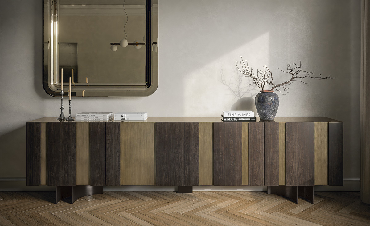 The entire structure is finished in the exclusive Oxybrass finish, brushed freehand with artisan mastery. The doors are fitted with burnt oak inserts, which give the structure dynamism by protruding outwards.