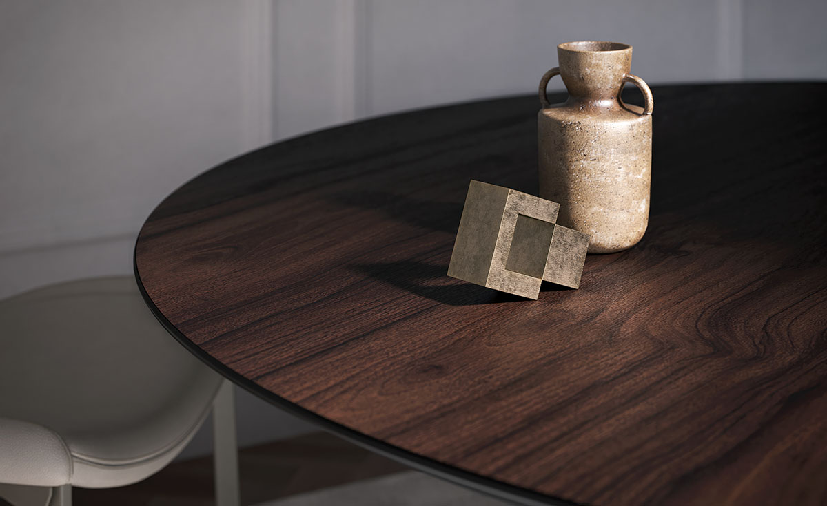 Table with base in titanium (GFM11) or bronze (GFM18) embossed lacquered steel. Top in Canaletto walnut (NC) or burned oak (RB). Optional central swiveling tray Lazy Susan.