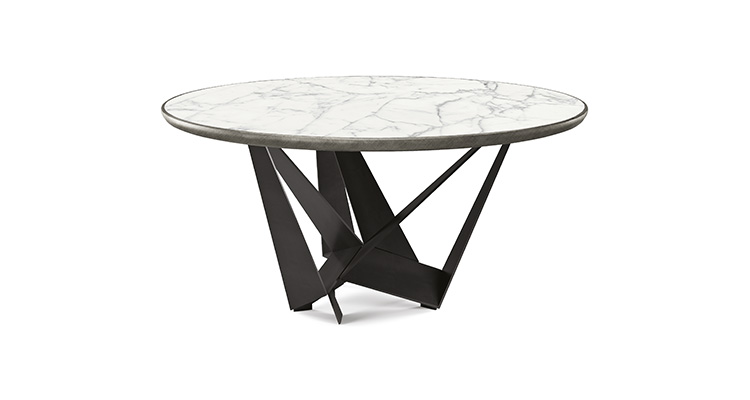 Table with base in titanium (GFM11), bronze (GFM18), graphite (GFM69), pearl (GFM70) or black (GFM73) embossed lacquered steel, Brushed Bronze or Brushed Grey lacquered steel. Top in ceramic Marmi Alabastro (KM02), matt Golden Calacatta (KM05), glossy Golden Calacatta (KM06), matt Portoro (KM07), glossy Portoro (KM08), glossy Sahara Noir (KM09), Makalu (KM11), Breccia (KM12), matt Borghini Calacatta (KM18), Colosseo (KM21), Andromeda (KM22), matt Invisible (KM24) or Luxor (KS23) with Brushed Bronze or Brushed Grey lacquered and rounded lower profile. Colour and brushing variations of the Brushed finish are characteristics of the handcrafted processing and should not be considered as defects.
