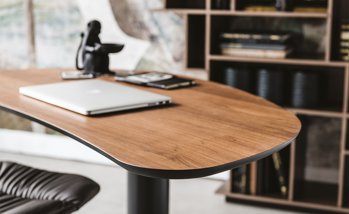 The modern wood desk Malibù designed by Paolo Cattelan with soft shapes, perfect for a home office or to furnish a reading corner with elegant minimalism. The Malibù design desk has a cylindrical base in painted steel, which forms a triangle with the supports on the ground. The top in fine wood has been worked with the mastery of Italian craftsmanship, evident in the rounded profile of the edges. This wood desk is an essential and refined piece of furniture in a modern living area.
