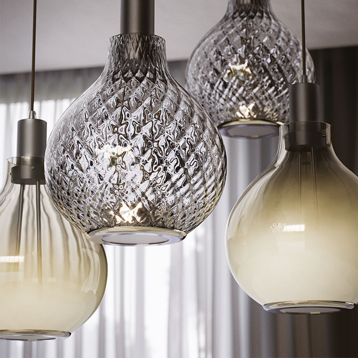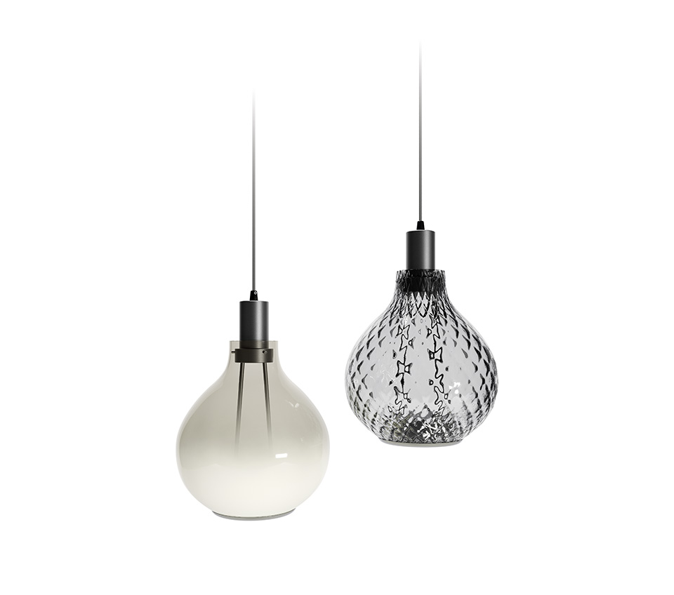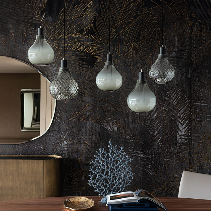 These modern lamps allow for endless configuration possibilities, blending shades made with two distinct artisanal glass-making techniques. Each lampshade can be suspended individually from the ceiling or mounted on a circular base that holds between two and six pendants, arranged at varying heights and distances to suit your personal taste.