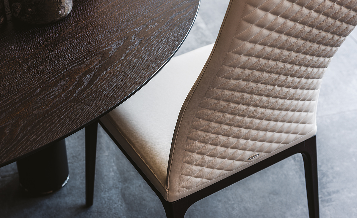 The genuine comfort of a modern design chair is complemented with a timeless allure. Arcadia has a sophisticated/refined style: its elegant simplicity - combined with the refined workmanship of the wooden base - makes it an essential component for the living room area, both for residential projects and design workspaces. The structure made of high-quality solid wood and the refined range of finishes create multiple style combinations that are available in all versions, including the one with a high back, the kitchen stool and the Arcadia Couture model. The latter is made by a glam diamond-quilting on the backrest of the soft leather chair.