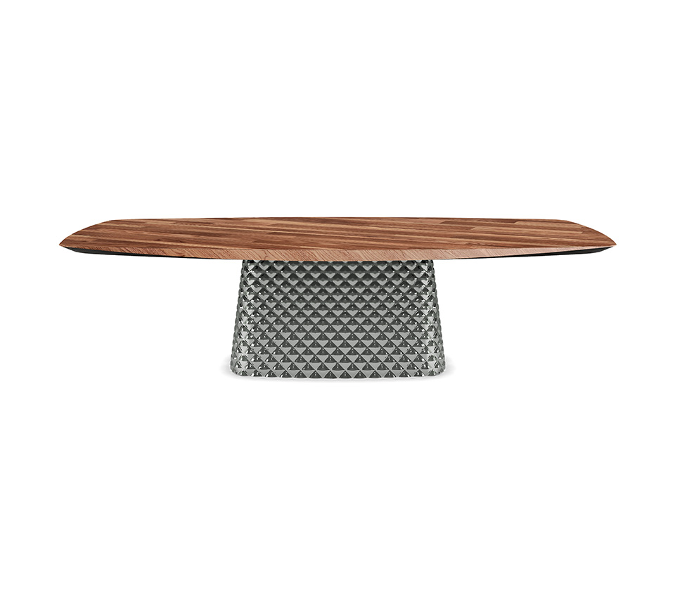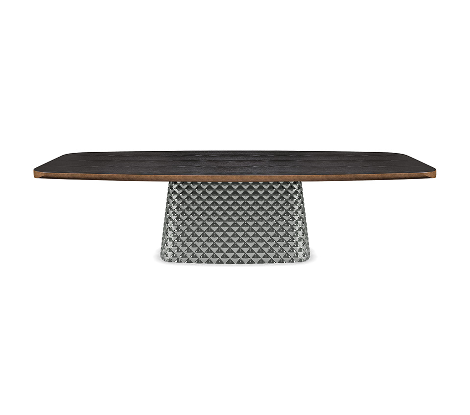 Table with base in mirrored and quilted fumé or bronze curved glass. Version "B": barrel top with angled edges in Canaletto walnut (NC) or burned oak (RB). "Masterwood" version: boat shaped top in Canaletto walnut (NC) or burned oak (RB) made of diagonal wooden planks of different sizes. Oblique and rounded edges. Colour and brushing variations of the Brushed finish are characteristics of the handcrafted processing and should not be considered as defects.