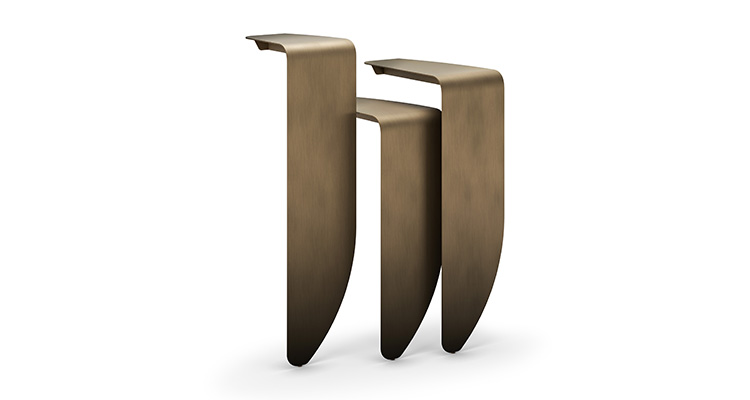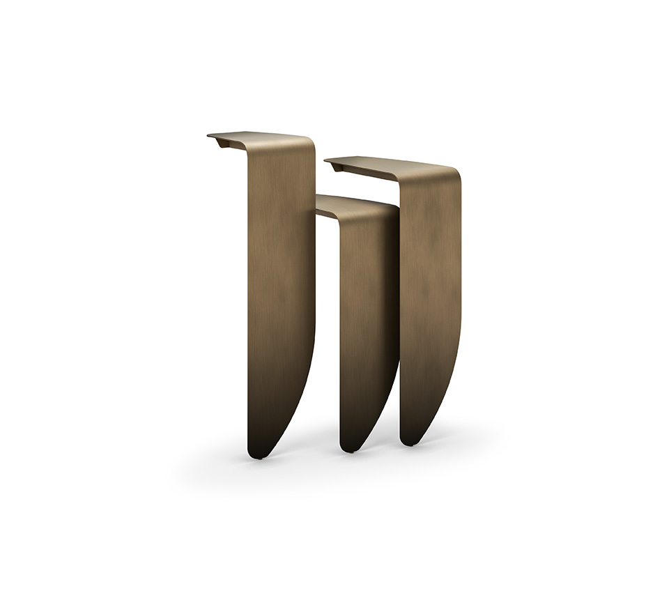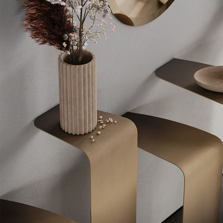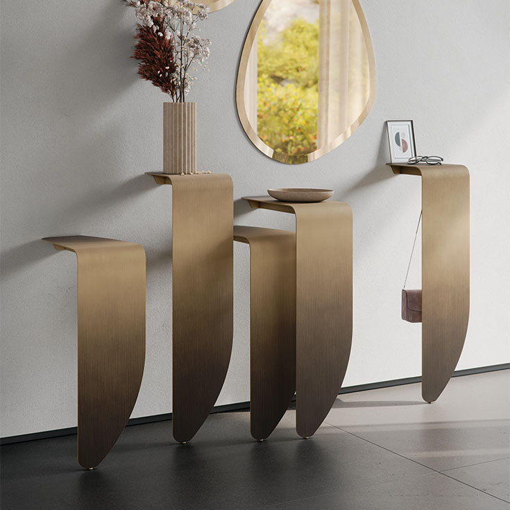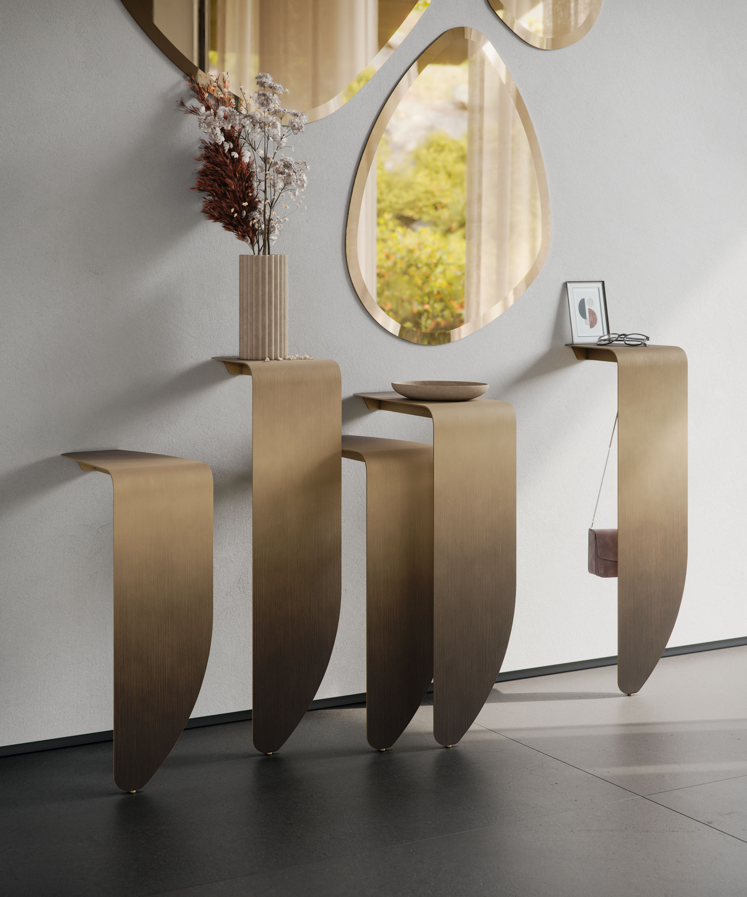 Furnishing and interior decoration intertwine in the design of the Peninsula metal console: a project that expresses great artistic flair and the very best of contemporary manufacturing techniques.Three units of different sizes compose the main wall-mounted console set, designed to be multiplied into infinite compositional possibilities, with either variable or uniform heights. From a compact wall-mounted console ideal for a relaxation corner or an entrance hall, to an original decorative sculpture extending along a wall or corridor, every possible composition possesses a constant element of uniqueness: its perpendicular orientation to the wall.