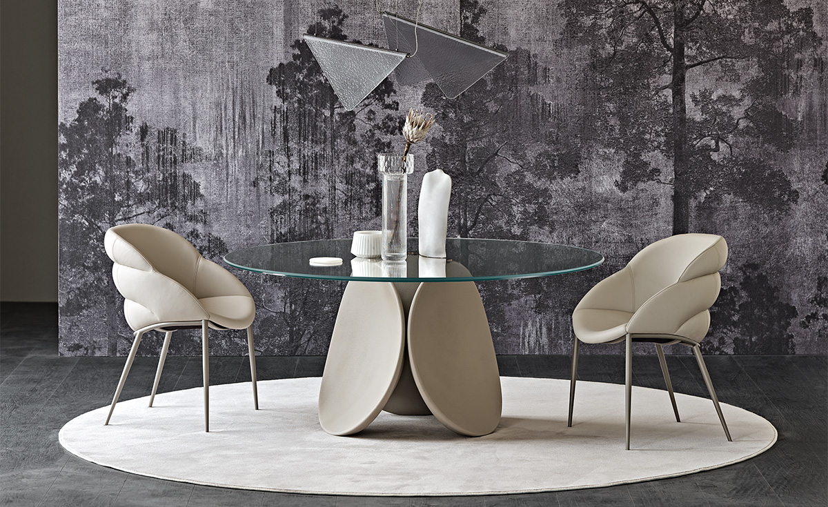 Maxim comes in two versions: a round table with a transparent glass top that lets you appreciate the sculptural base in its entirety, and the Maxim Argile model completely spatulated in clay, lending it an even more organic look. “When the material is sufficient in itself, without superstructures or additions, we have a pure and direct object that is already a finished product,” explain the designers Pio and Tito Toso.
