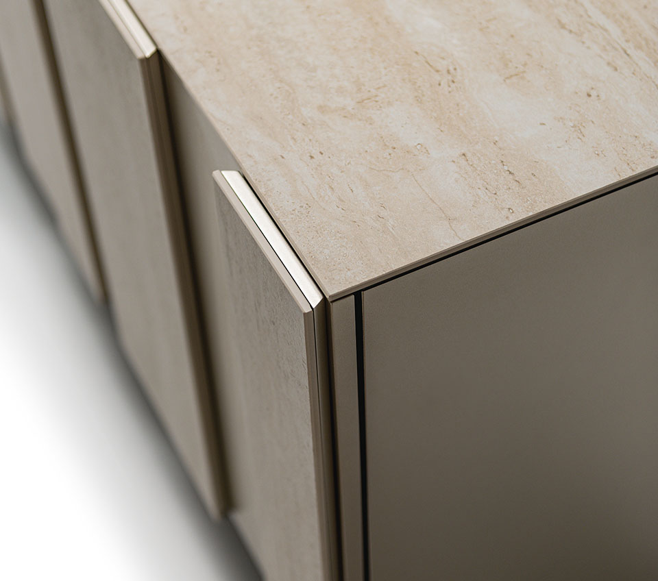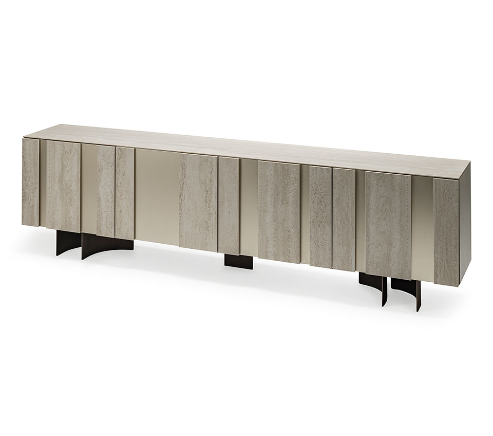 Sideboard 2, 3 or 4 doors with structure in titanium (M11) lacquered wood. Doors in titanium (M11) lacquered wood with Marmi Colosseo (KM21) ceramic inserts. Feet in titanium (GFM11) or bronze (GFM18) embossed lacquered steel. Top in Marmi Colosseo (KM21) ceramic. Internal shelves in clear glass. Optional: internal drawer in each door.