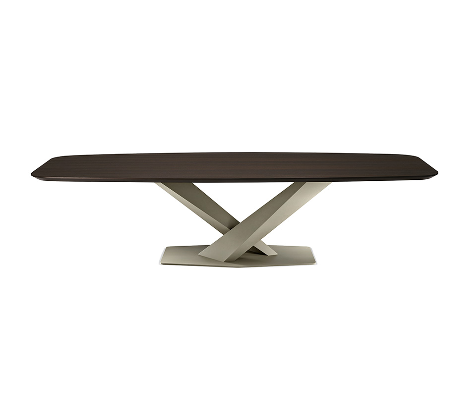 Table with base in titanium (GFM11), bronze (GFM18), graphite (GFM69) or black (GFM73) embossed lacquered steel. Top S version 4cm thick with irregular solid wood edges in Canaletto walnut (NC), burned oak (RB) or natural oak (RN). Version "B": barrel top with angled edges in Canaletto walnut (NC) or burned oak (RB). "Masterwood" version: boat shaped top in Canaletto walnut (NC) or burned oak (RB) made of diagonal wooden planks of different sizes. Oblique and rounded edges. Version "Y": with bevelled edges in Canaletto walnut (NC) with details in burned oak or burned oak (RB) with details in Canaletto walnut.