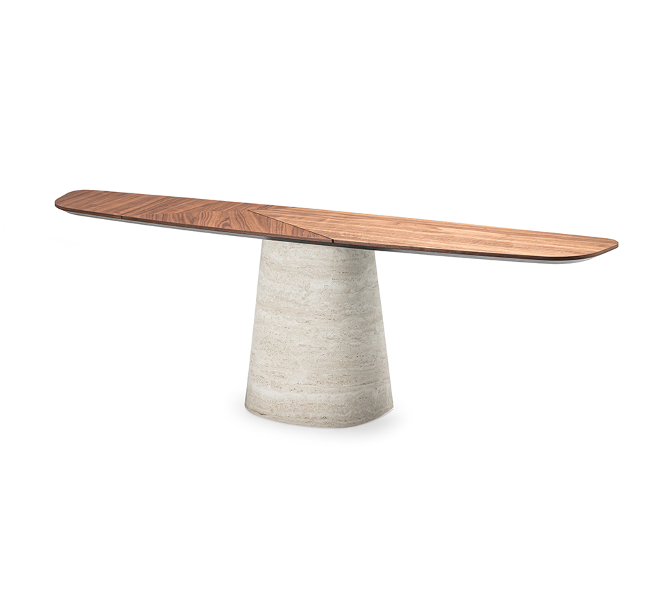 Tables with central base Rado are joined by two perfectly symmetrical hubs. One detail is noticeable on the short side of the plinth: the recessed vertical groove covered in ceramic, which breaks up the otherwise uniform surface. The result is a modern ceramic table that embodies a new contemporary aesthetic, combining classic finishes inspired by natural marble with previously unseen production techniques.