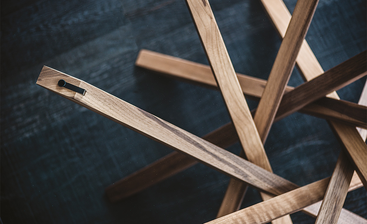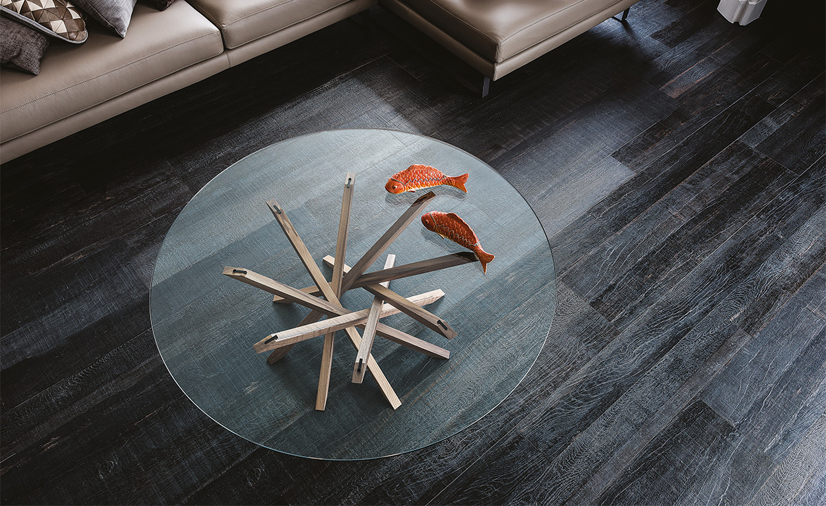Atari, designed by Giorgio Cattelan, is a glass coffee table for the living room with a base formed by a spiral of balanced wooden elements, on which a splendid glass top rests. The 8 legs of this square or round modern coffee table are made of fine wood and appear to simply lean against each other, like a Mikado. In addition to being original, the composition is made prestigious by the excellent manufacturing and the attention to detail. The transparent glass top allows you to fully appreciate the beauty of the base. In the larger version, the base is duplicated, as is the charm of the rectangular glass table as a whole.