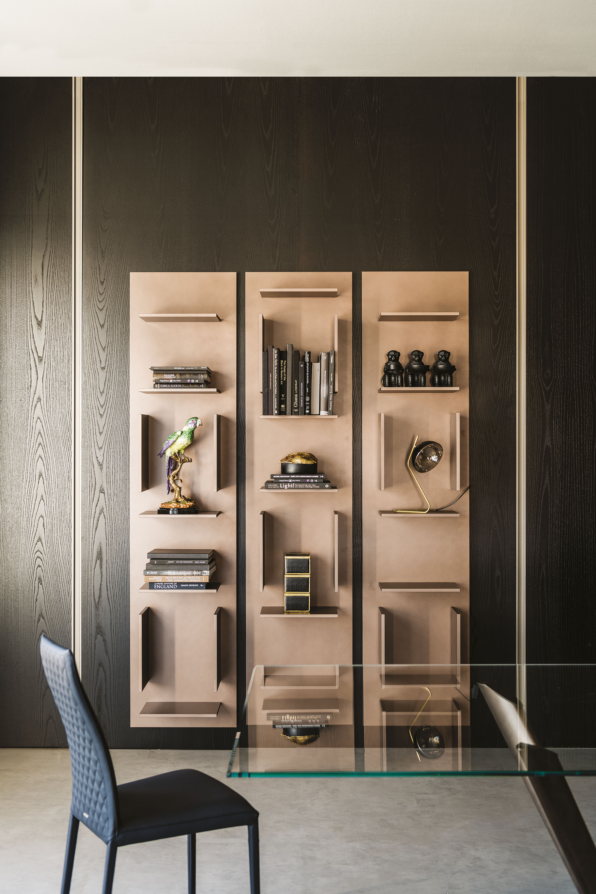 Fifty is composed of a single vertical wall-hanging element, which looks at its best when two or more modules are placed side by side and rotated by 180°. The regular rhythm of this composition is marked by its rectangular compartments, which highlight the books and objects showcased on the shelves of this design bookcase, representing one's passions and interests.