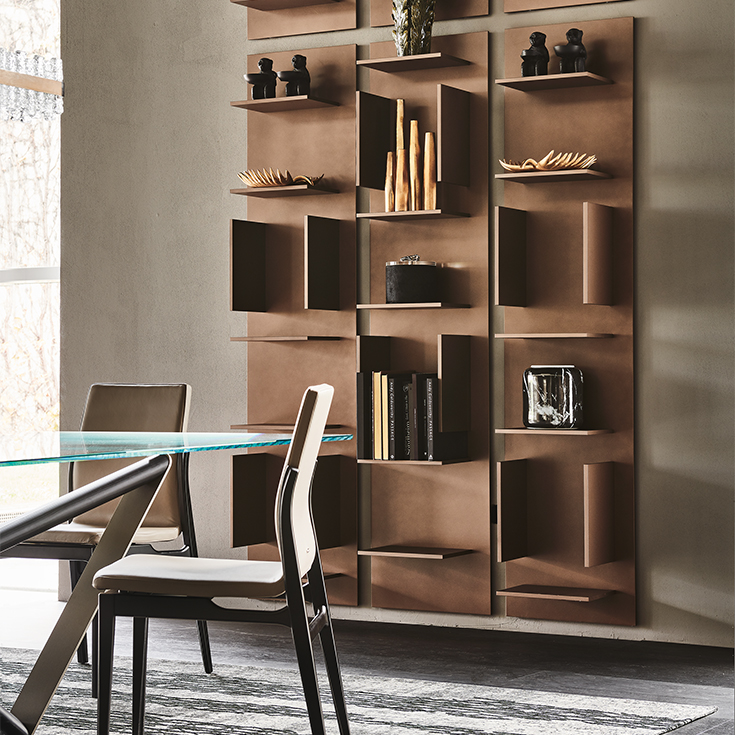 Fifty is composed of a single vertical wall-hanging element, which looks at its best when two or more modules are placed side by side and rotated by 180°. The regular rhythm of this composition is marked by its rectangular compartments, which highlight the books and objects showcased on the shelves of this design bookcase, representing one's passions and interests.